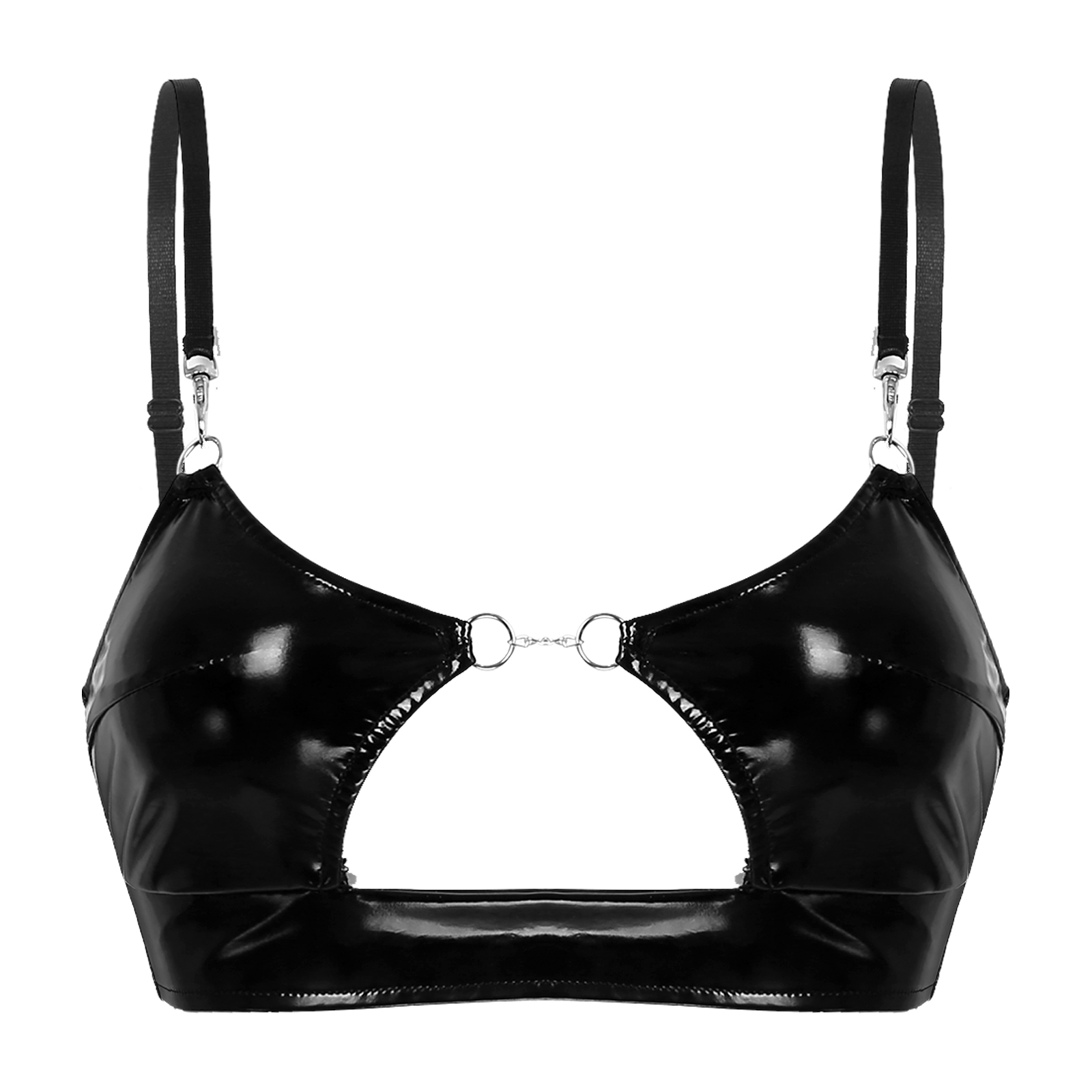 Women Hollow Out Bra Sleeveless Shiny Wet Look Patent Leather Crop Top Adjustable Straps Zipper Camisole Sexy Lingerie Underwear