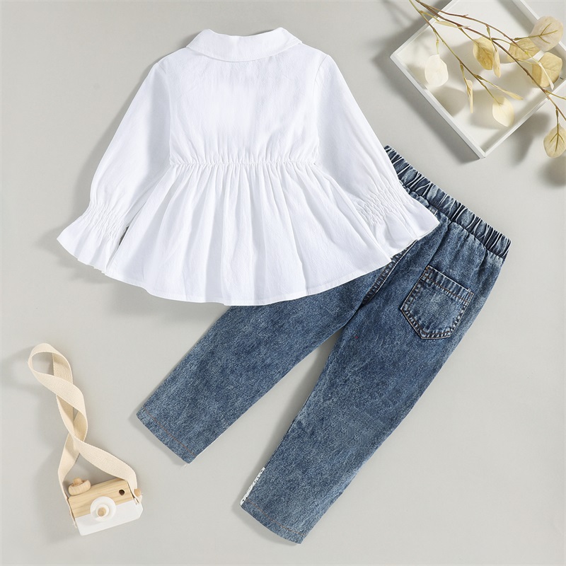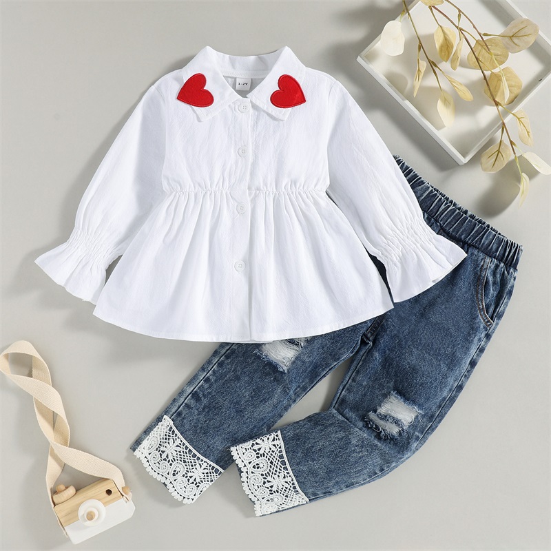 От 1 до 6 лет белая рубашка с длинными рукавами и рисунком сердца для маленьких девочек топы, кружевные рваные джинсы джинсовые штаны, комплект одежды из 2 предметов для девочек