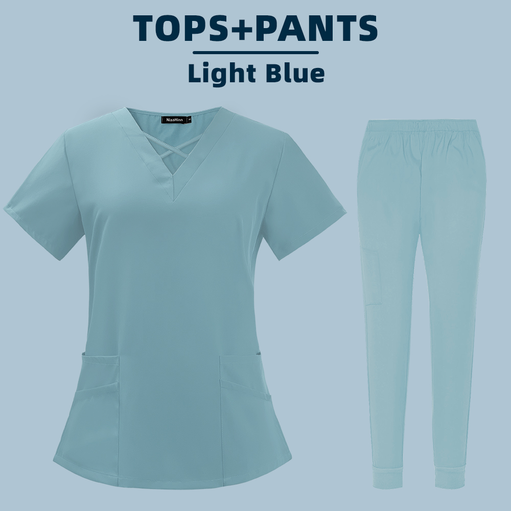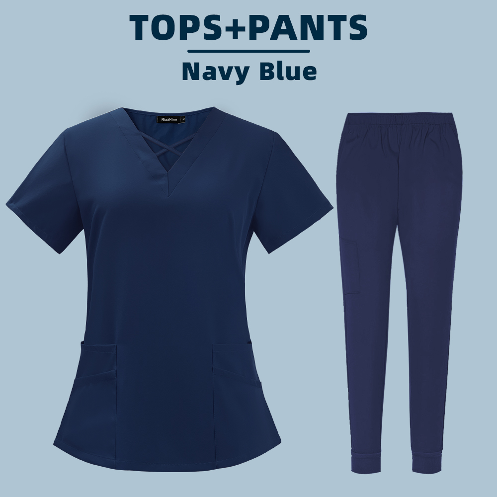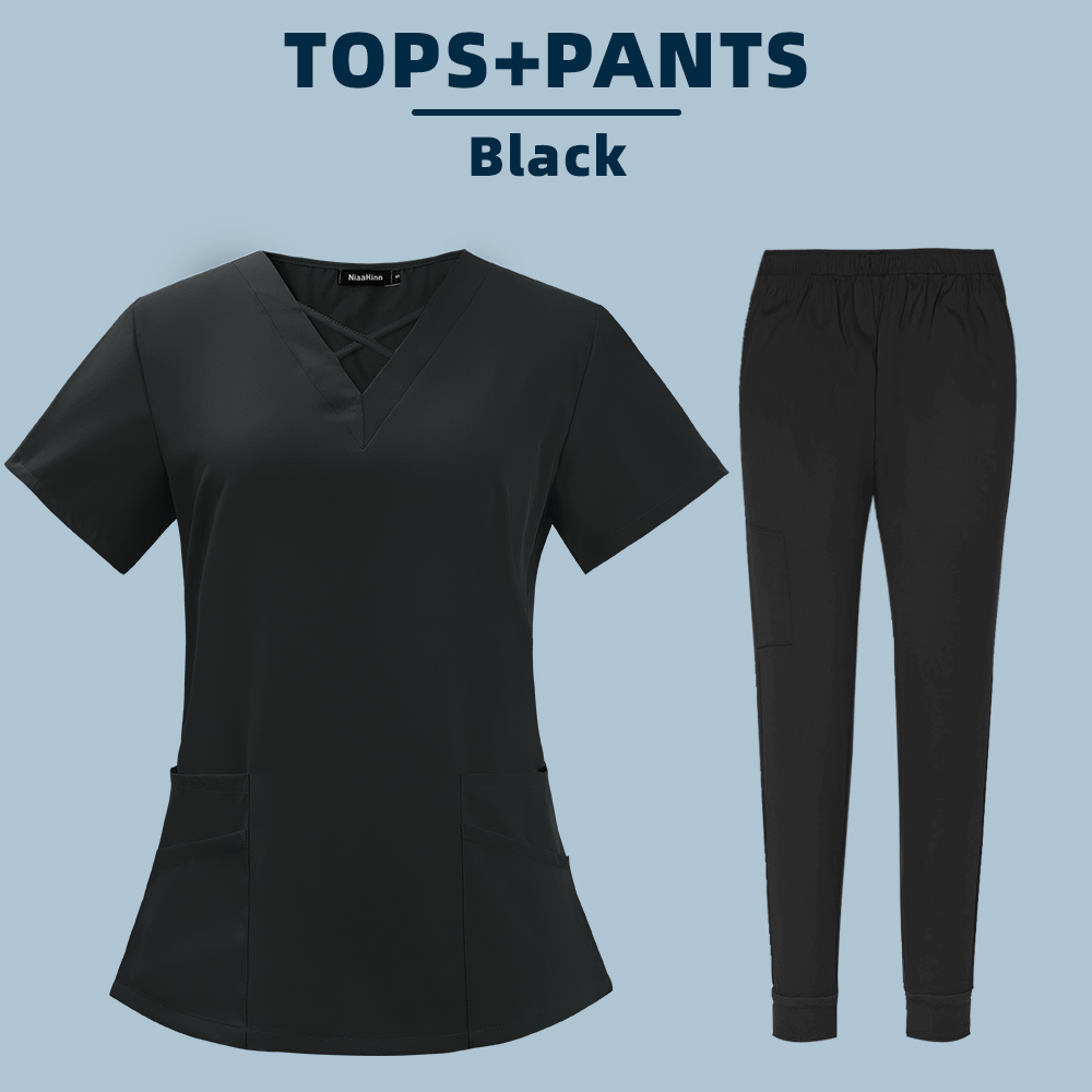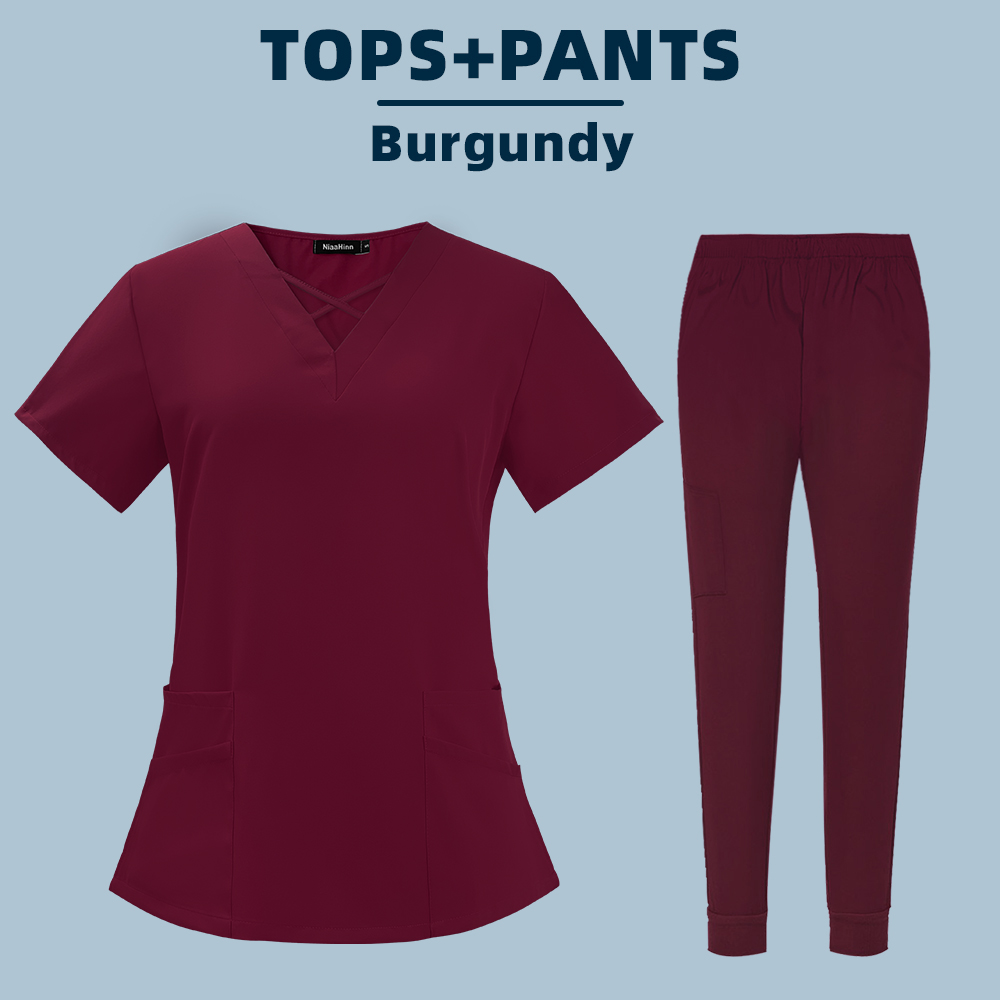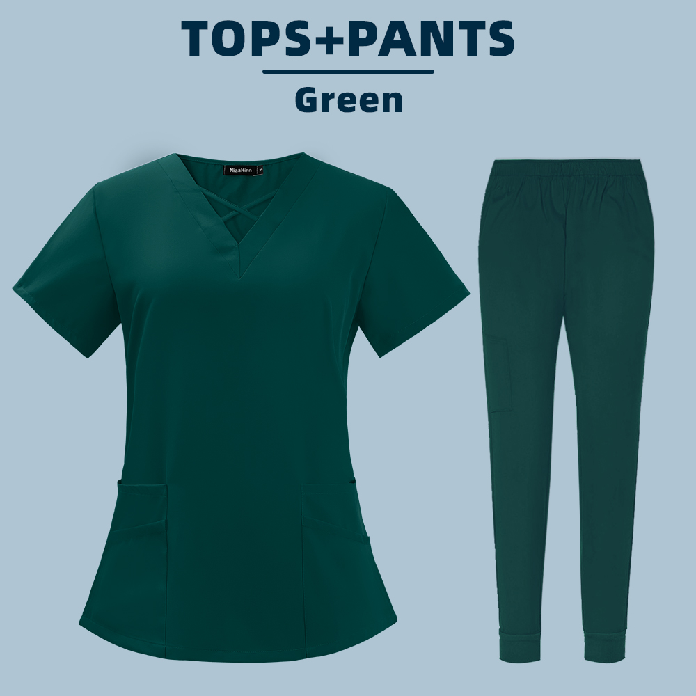 Однотонные скрабы с V-образным вырезом костюмы (Топы + брюки) косметологическая