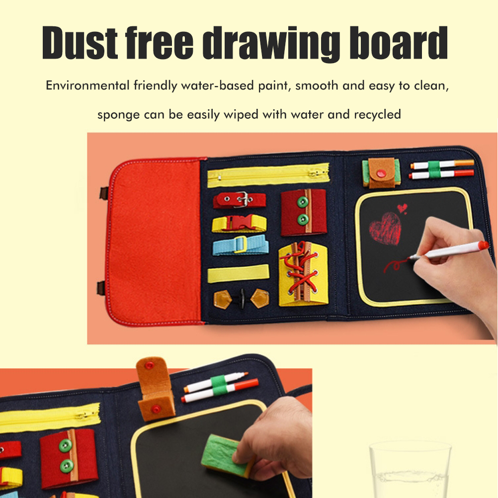 4. Durable and safe material: Busy board is made of soft felt, soft and durable. The toy includes 1 zipper, 1 shoelace, 2 buttons, 1 hook and loop fastener, 3 buckles, 1 erasable drawing board, 2 watercolor pens and sponge wipes. (Reminder: Wet the sponge wipes before use.)