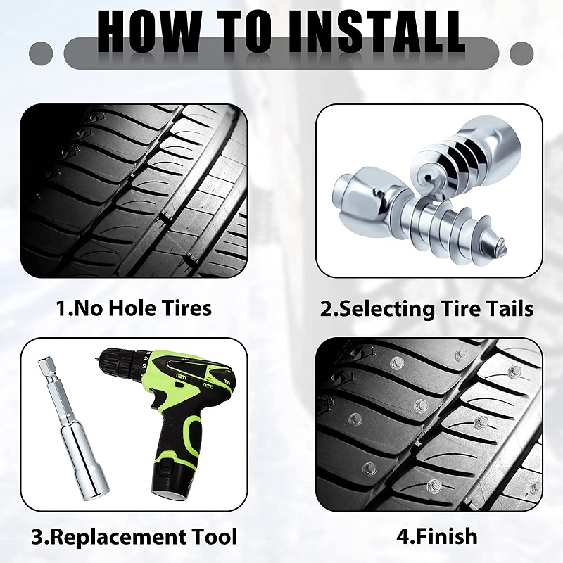 3. Легко и быстро установить: винты из твердого сплава для шиномонтажа очень легко установить с помощью инструмента для установки, просто положите винт на сверлильный станок с металлическим рукавом, И затем сверлите винт в шину, удобно и время.