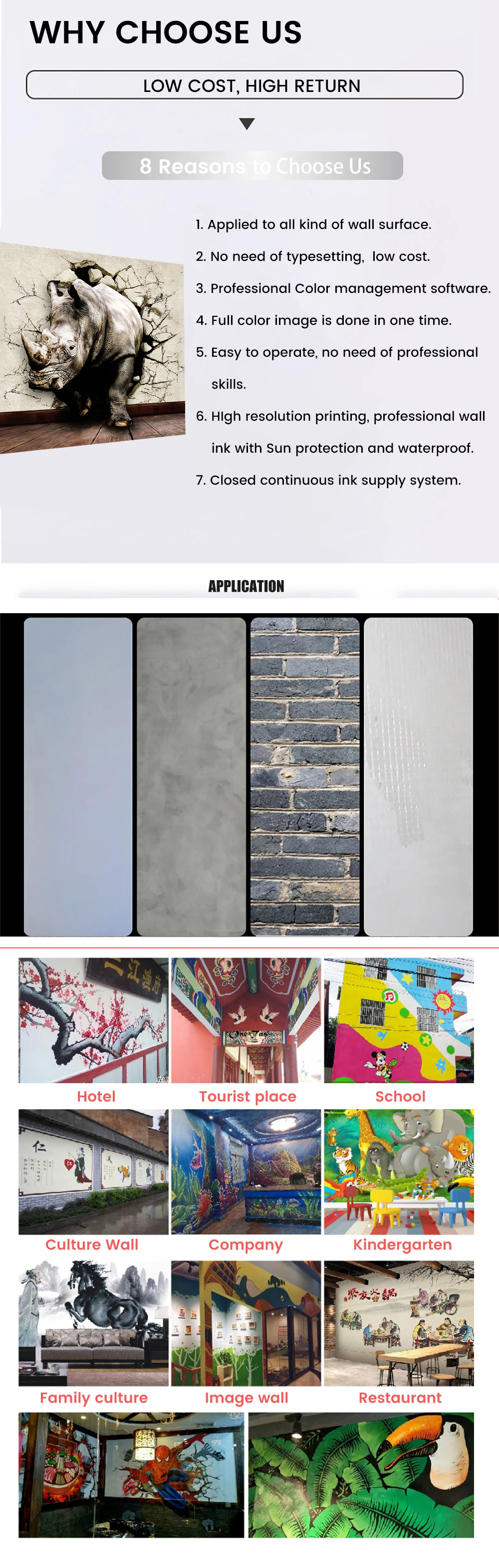 2. Этот вертикальный настенный принтер использует УФ-чернила Epson, не нужно нагревать при температуре от минус 10 ℃ до нуля 60 ℃ в нормальной рабочей среде, без льда и постоянно погружать.