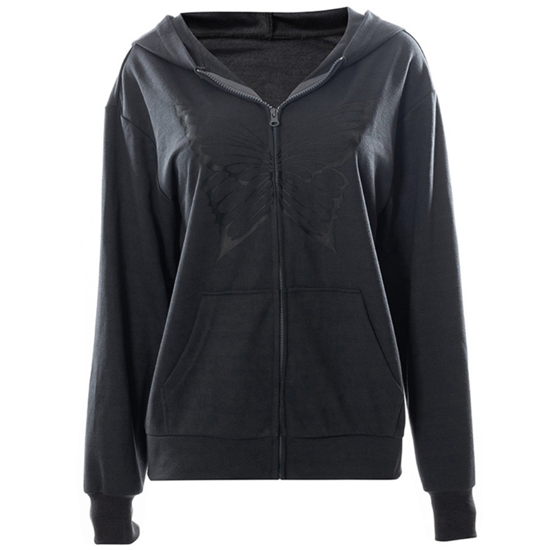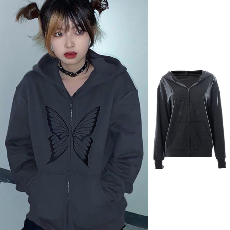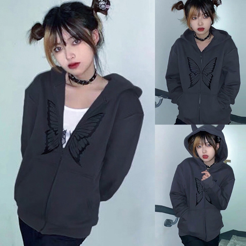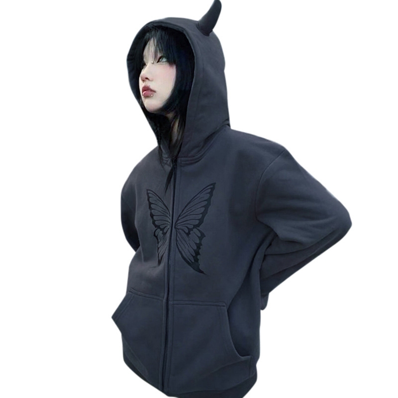 066C женская готическая панк серая толстовка с длинным рукавом Harajuku 3D Дьявол Ox рога на молнии Толстовка пальто с принтом бабочки хип