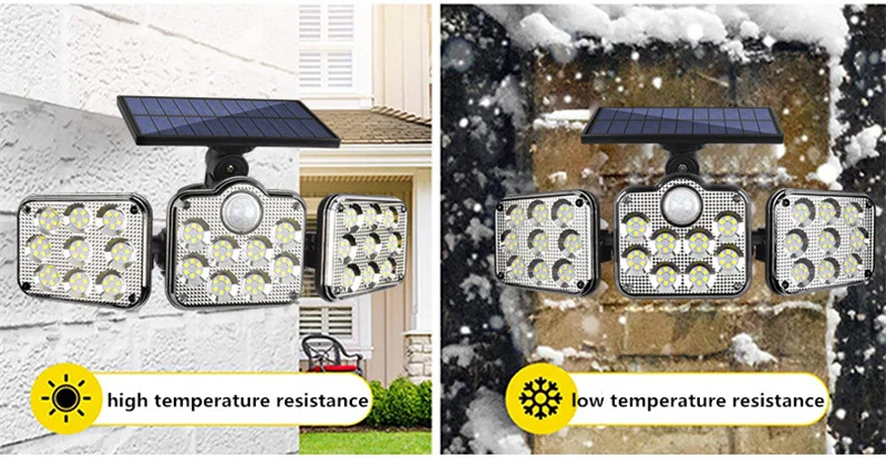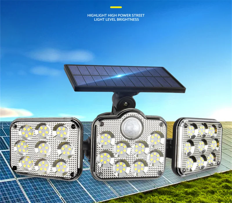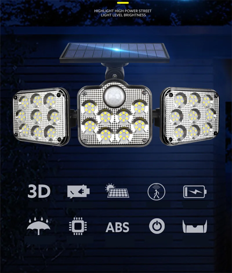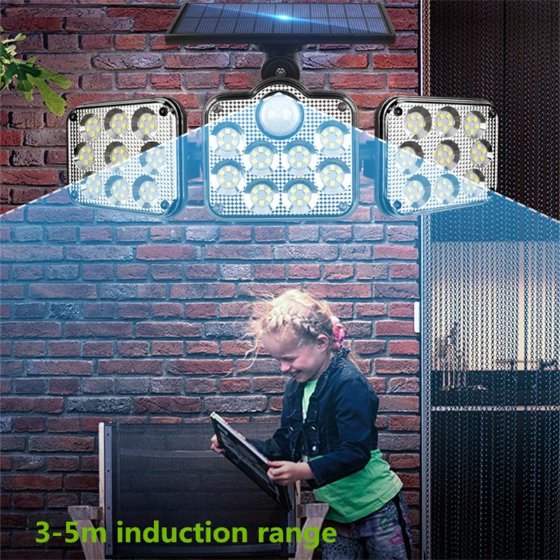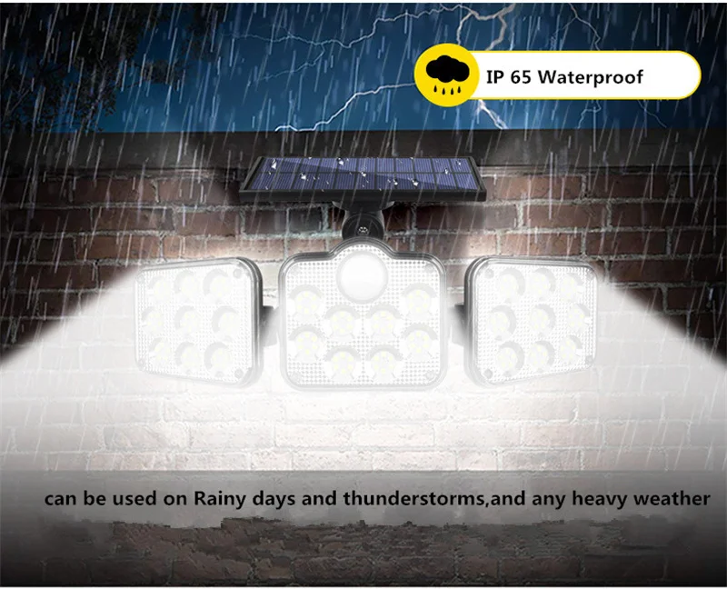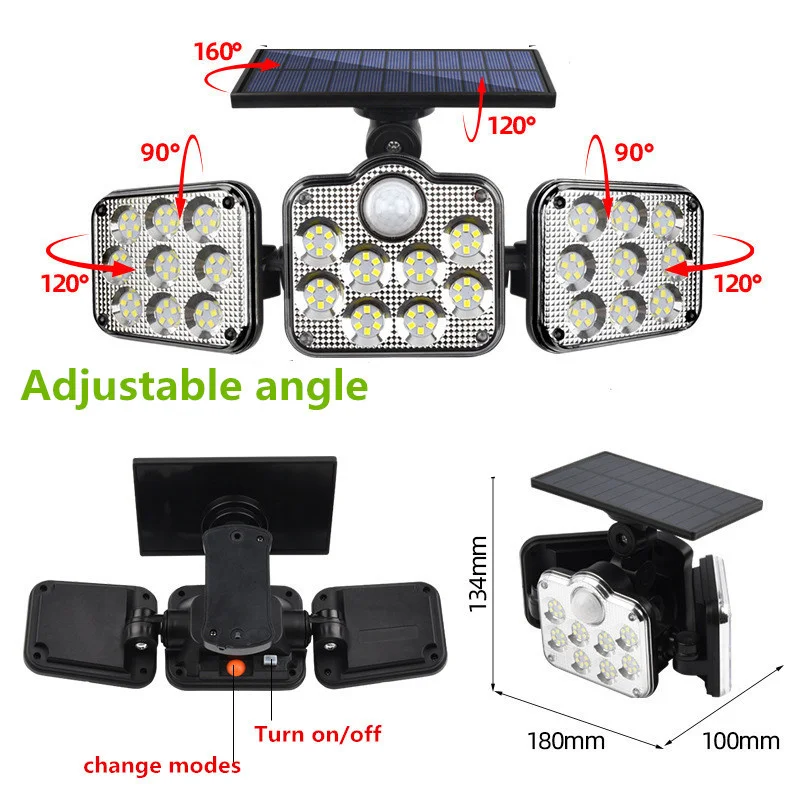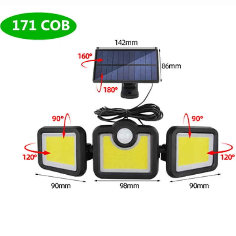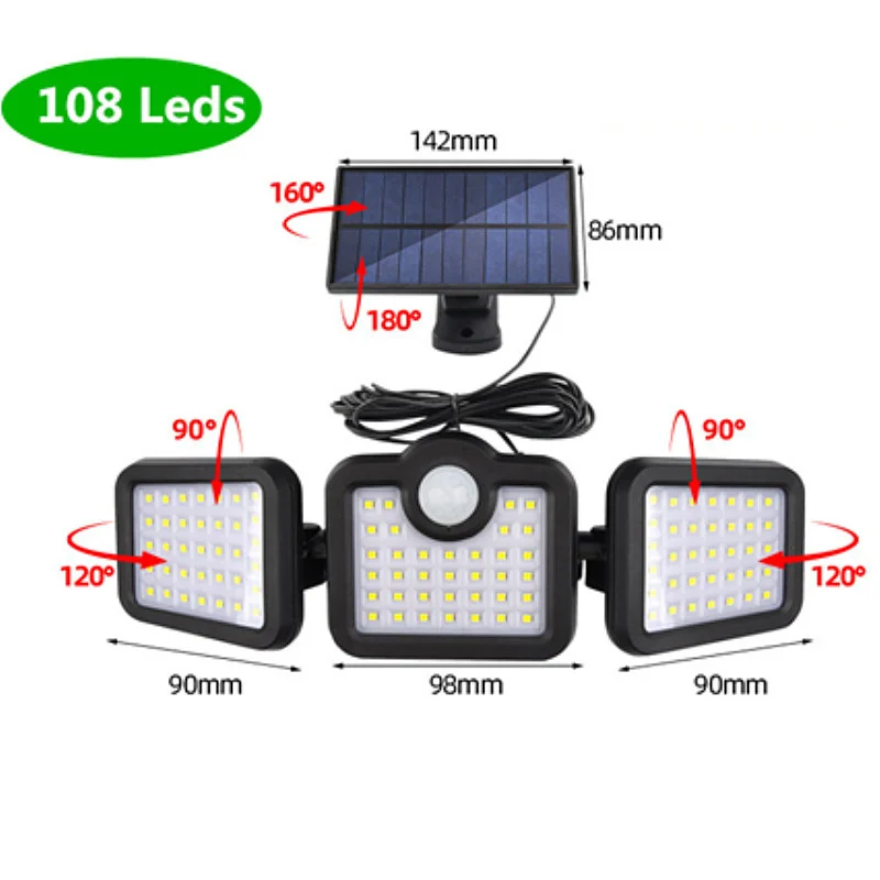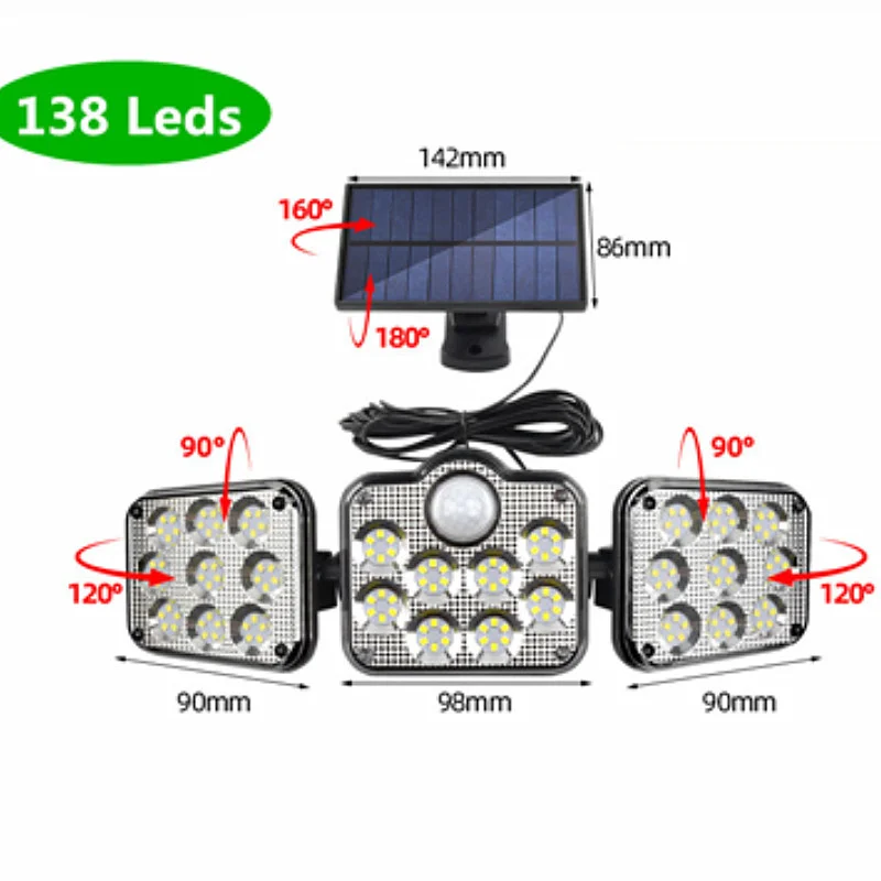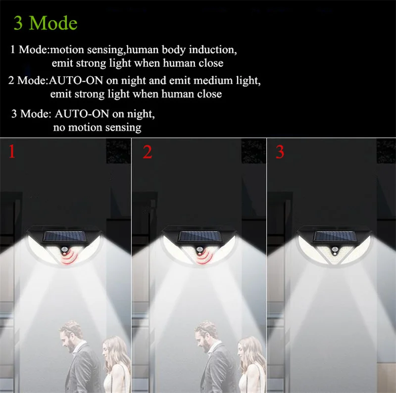 Specifications:<;br/>Bulb type:LED solar Lights / Wall lamps<;br/>Light source: Solar panel<;br/>Watt: 108 leds / 122 leds / 138 leds / 171 COB<;br/>Wire length:5m<;br/>Light color: White<;br/>Charging hours: 8hrs<;br/>Working hours: more than 8hrs<;br/>Control modes: Light control / Motion sense(human body induction)<;br/>Sensor angle:120°<;br/>Sensor distance:3-5m<;br/>Protecting grade: IP65<;br/>Material: ABS<;br/>NOTICE:<;br/>Please make sure the solar light been installed within 3 meters height and make sure the solar panel can absorb sunlight.<;br/>Before use please turn on the switch.<;br/>2 control way ( light control / motion sense)<;br/>3-5M Induction range<;br/>IP65 Waterproof<;br/>Solar panel charging,energy-saving and green<;br/>270 degree beam angle,provide maximum illumination for large spaces<;br/>3 Modes<;br/>-- 1: Security Mode (motion sensor turns the light on and off automatically)<;br/>-- 2: Smart Brightness Control Mode (the light stays all night, it turns brightest when detects motion and turns into 10% brightness when people leave)<;br/>-- 3: No Induction Mode (30% brightness constant light ).