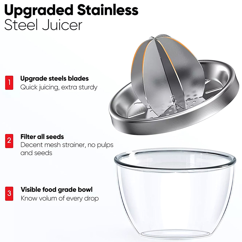 2. Легко чистить и хранить: соковыжималку из нержавеющей стали можно мыть в посудомоечной машине. Его также можно легко мыть вручную водой. Компактная соковыжималка для лимонов с компактной раскладушкой легко хранится на вашей кухне, не теряя аксессуары.