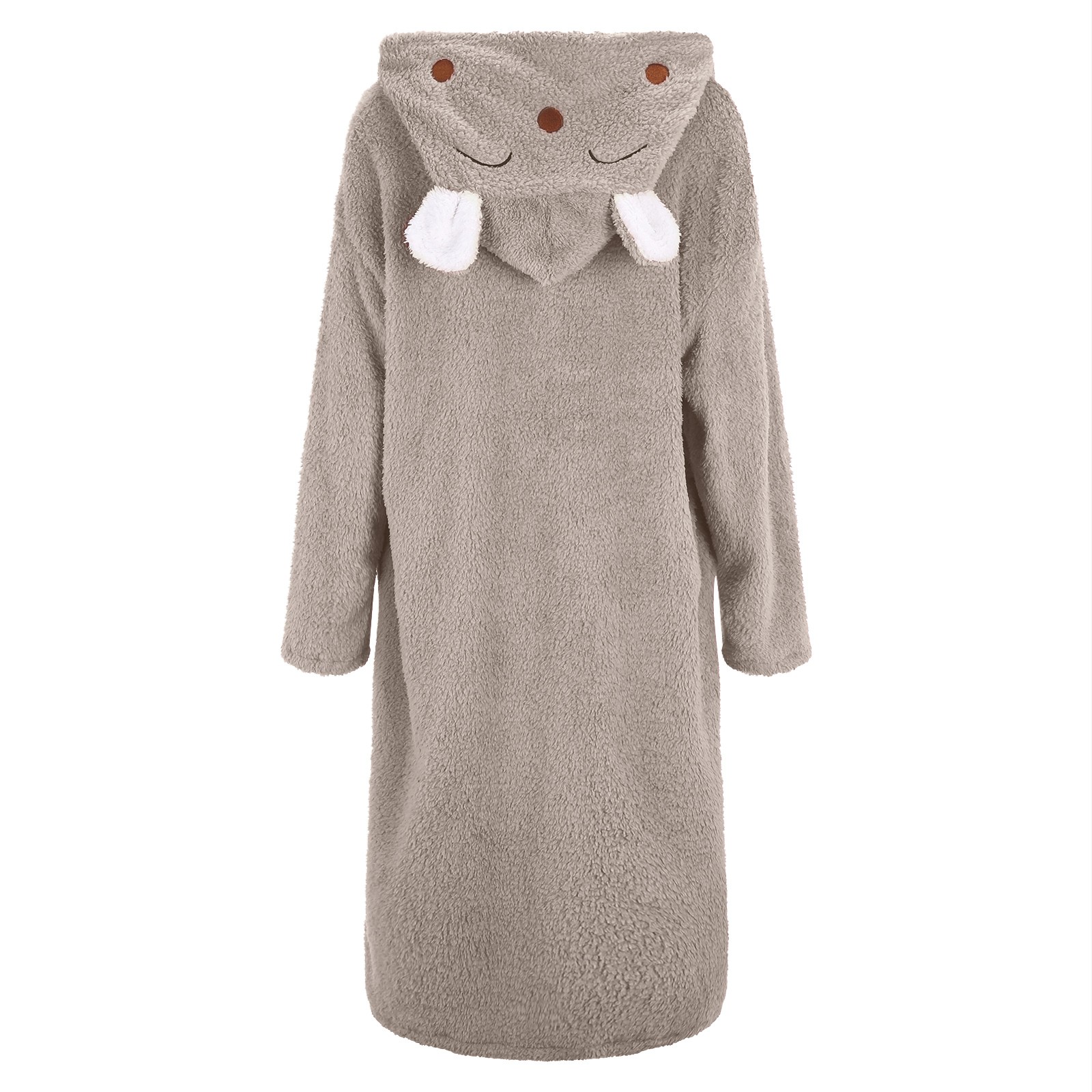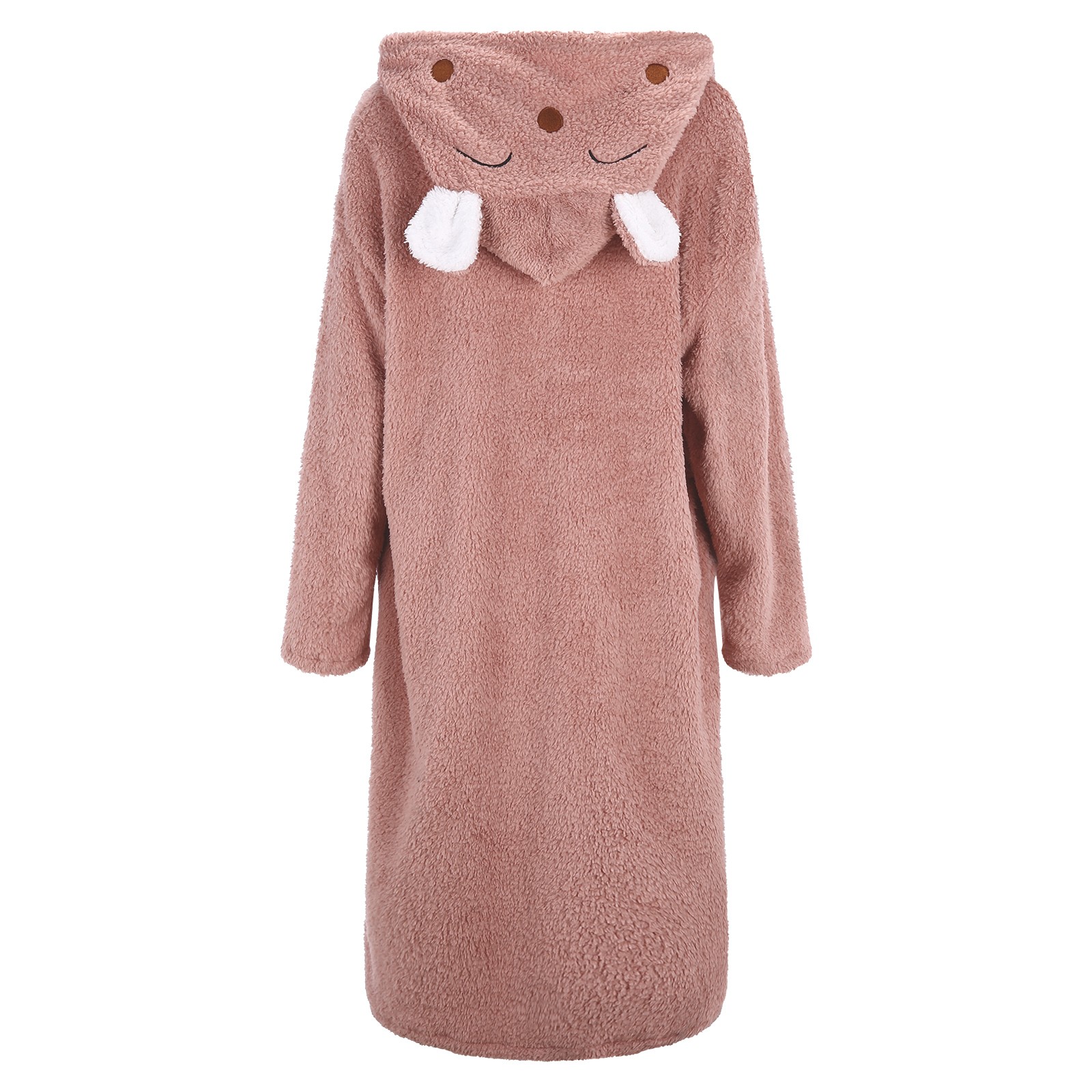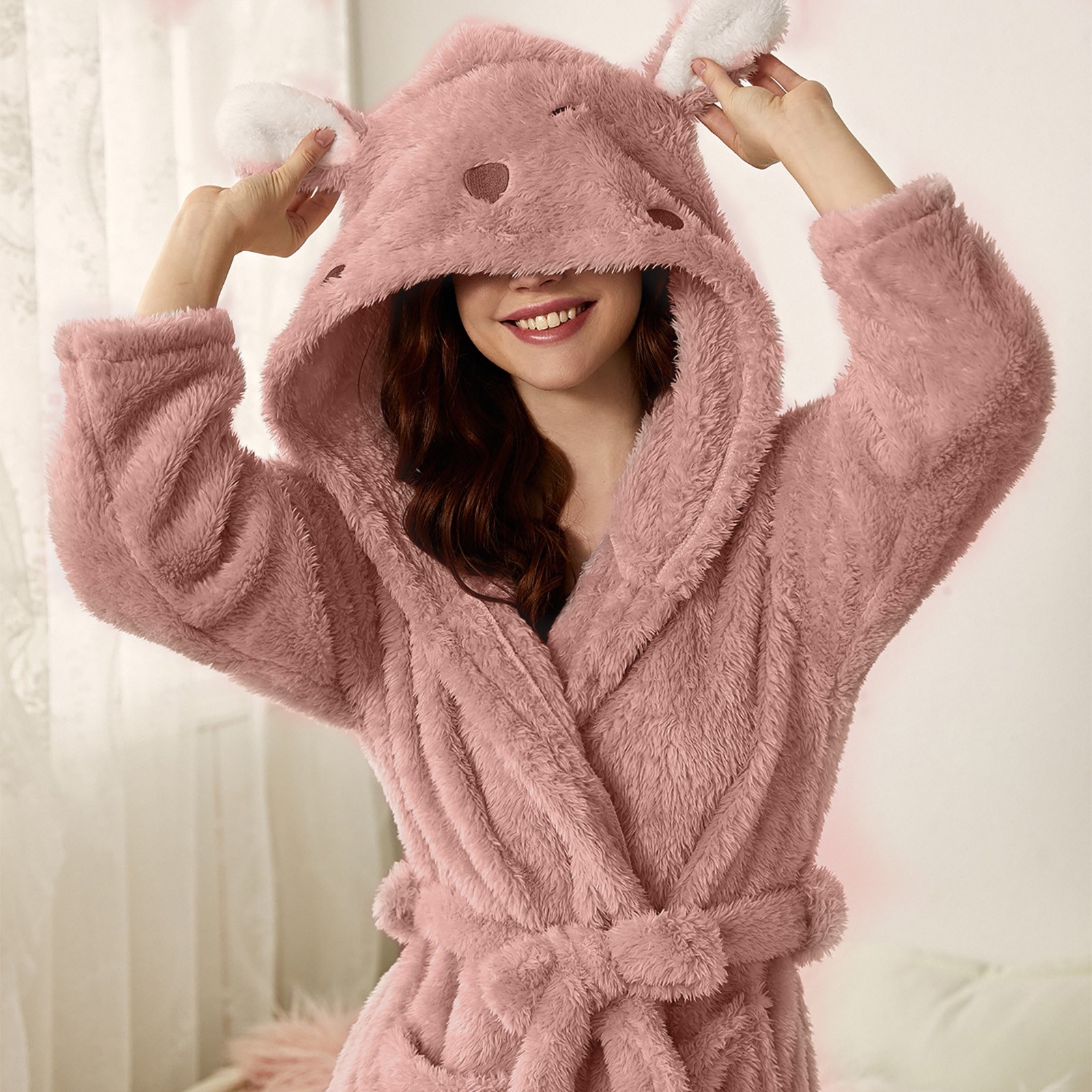 Women'S Double Pocket 3d Ear Hooded Flannel Bathrobe Soft And Warm Double-Faced Velvet Bathrobe Pajamas And Home Wear