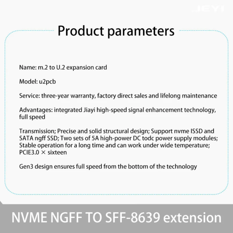 Преимущества: Интеграция высокоскоростной технологии увеличения Сигнала Jiayi и полноскоростной передачи; Точная и прочная конструкция; Поддержка NVME SSD и SATA NGFF SSD; два блока питания 5А высокой мощности постоянного тока в постоянный ток; Долгосрочная работа стабильна и может работать при широкой температуре; Конструкция PCIE3.0 X16 GEN3 обеспечивает полную скорость от нижней части технологии.