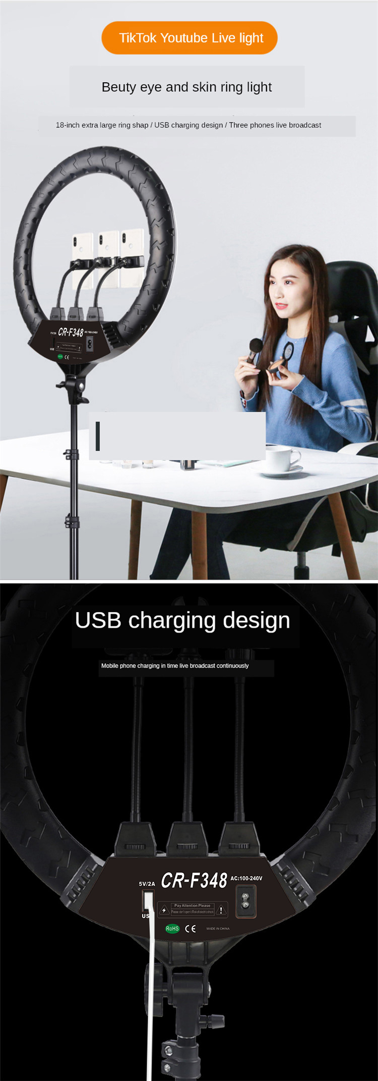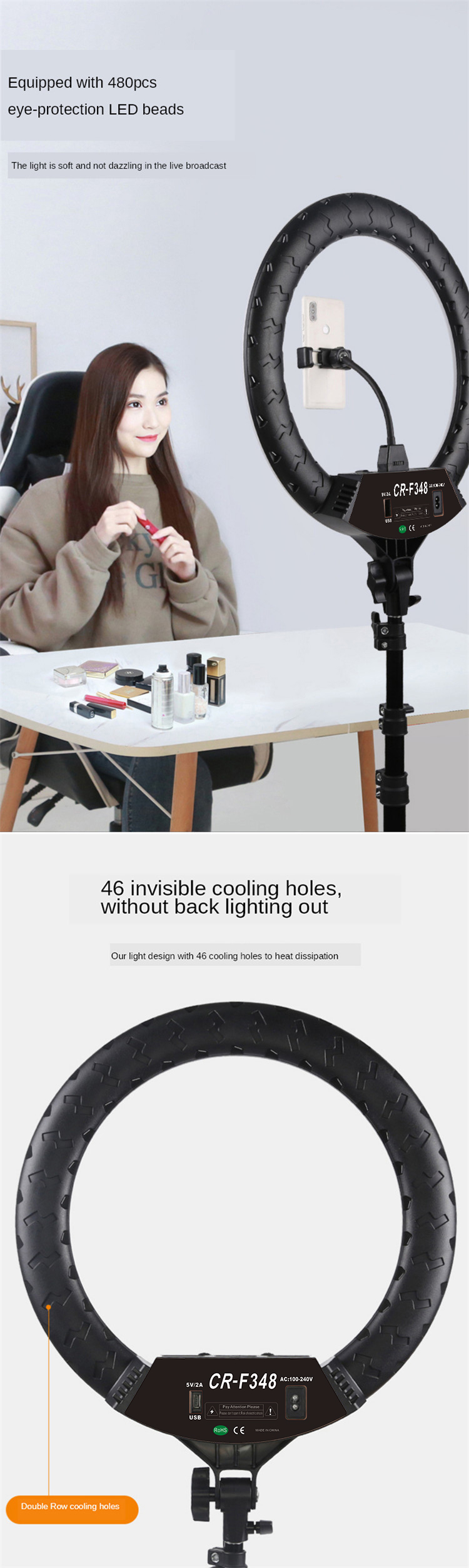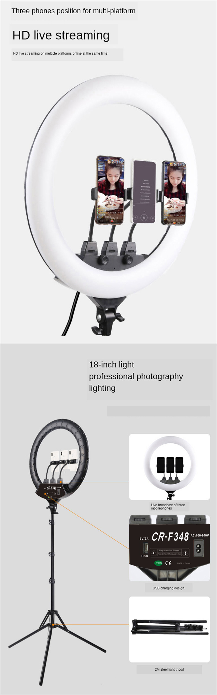 Посылка | CR-F348 кольцевой светильник * 1, светильник 200 см * 1, кронштейн для телефона * 3, сумка для переноски * 1, кабель питания * 1, беспроводной пульт дистанционного управления * 1 |