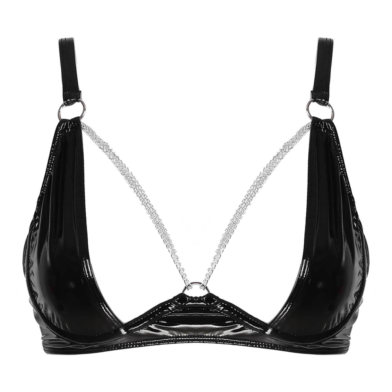 Сексуальные бюстгальтеры для женщин, Блестящий Мокрый Вид, лакированная кожа, бюстгальтер на косточках, топ с регулируемыми бретелями, металлическая цепочка, бюстгальтер, нижнее белье