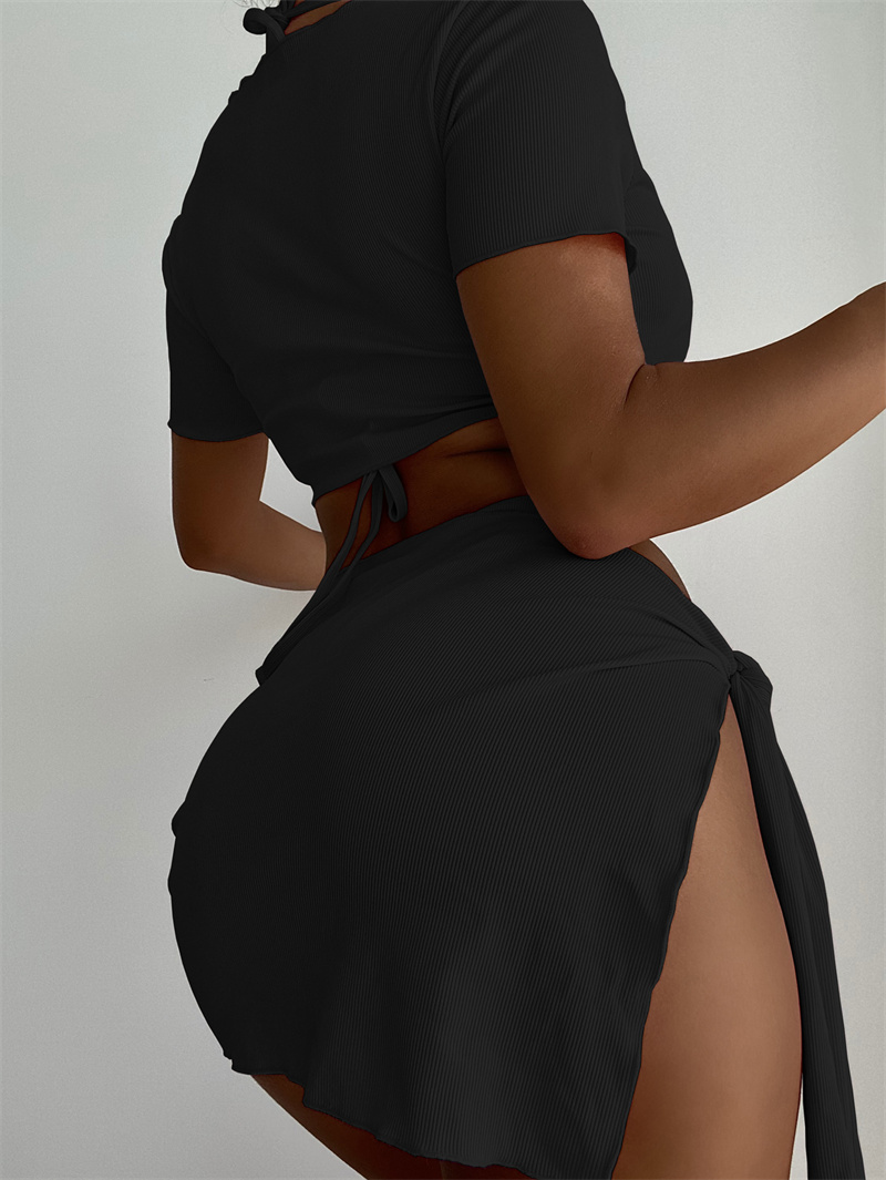 CHRONSTYLE 4Pcs Women Swimwear Bathing Bikini Set Tie-up Padded Solid Color Halter Bra Shirts Crop Tops Sarong Cover Ups Thongs