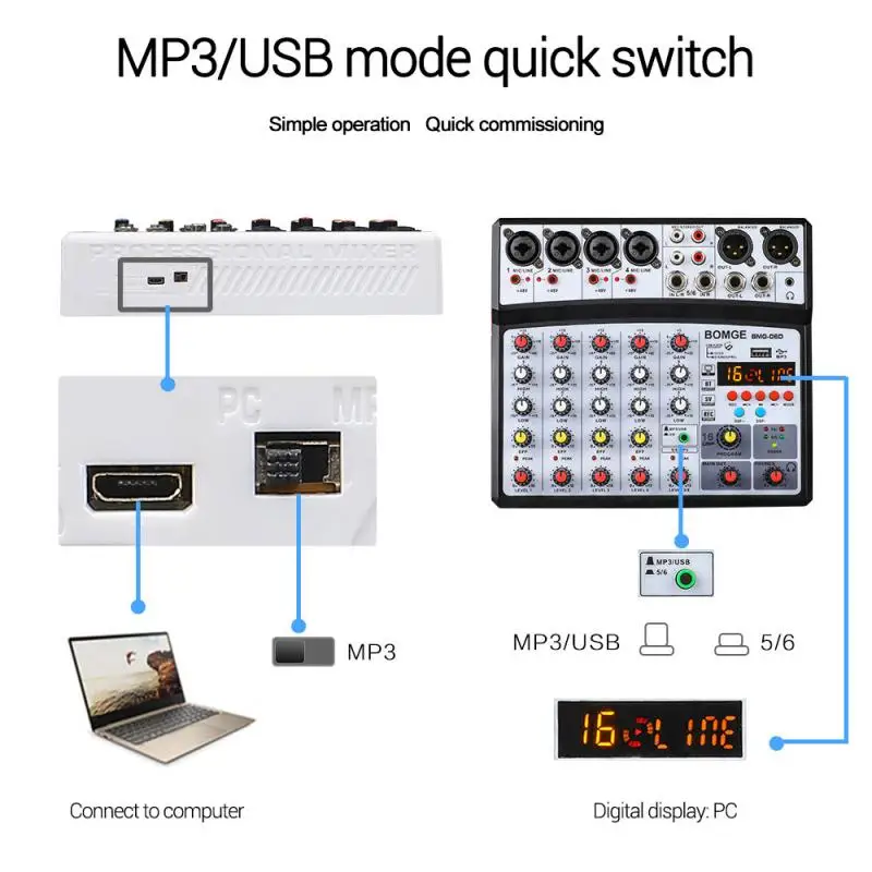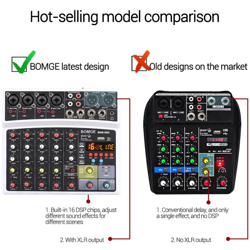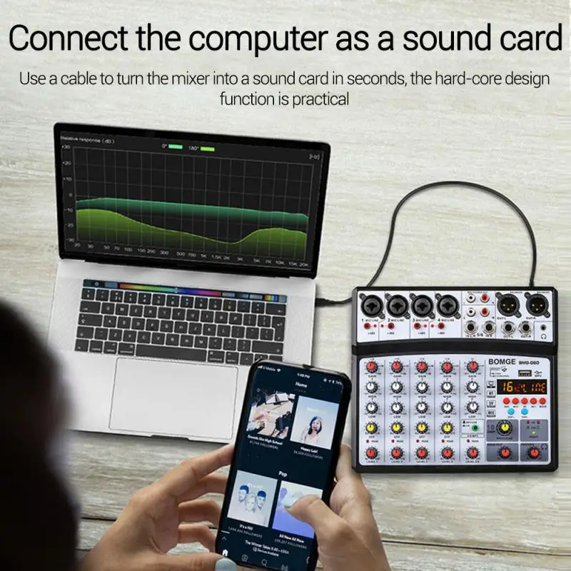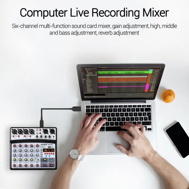Этот миксер-многоцелевой миксер со звуковым кард6channel, который может удовлетворить семейное музыкальное производство пользователя, онлайн-трансляцию, обложку KSong и другие потребности. Характеристики продукта: смеситель оснащен, Входное усиление и высокая регулировка басов, встроенный блок питания in48VPhantom подходит для прямого источника питания конденсаторного микрофона, выхода гарнитуры высокой четкости, MP3Player,Bluetooth приема, С разъемом pcsound card и 16 цифровыми эффектами.