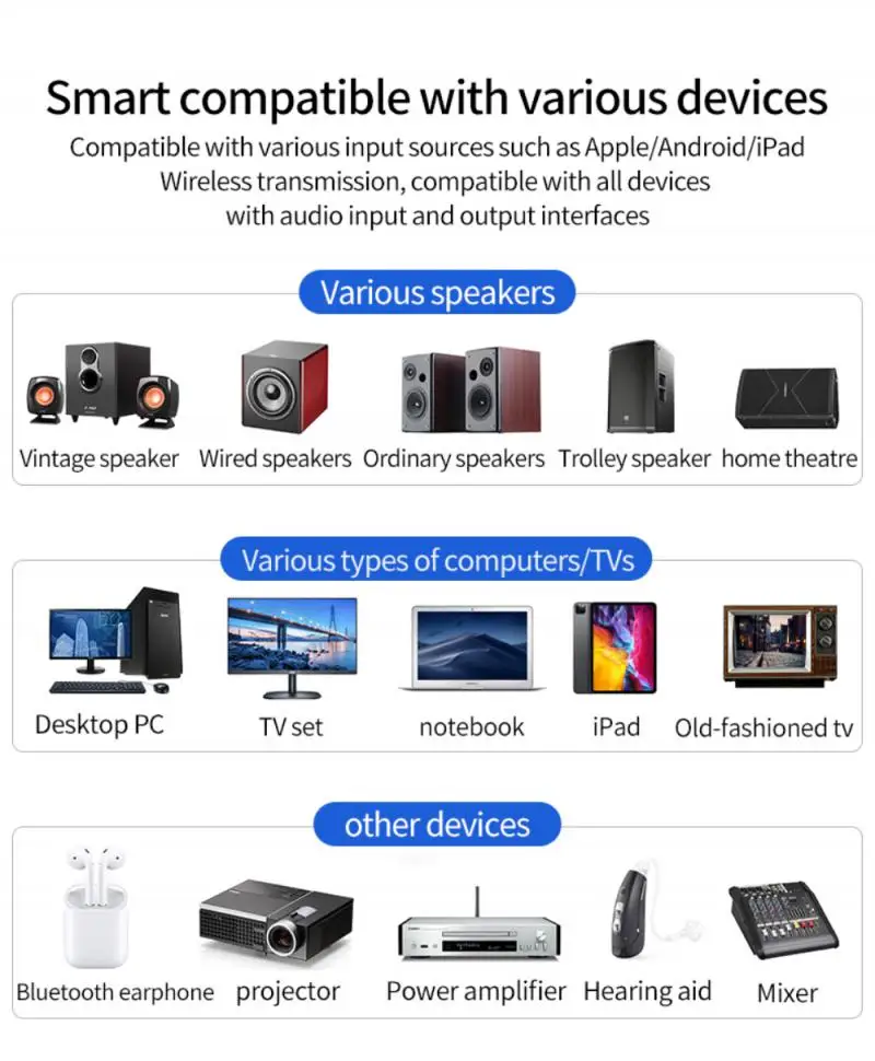 Совместимые устройства: мобильные телефоны и PAD с системой Android, IOS, проводные динамики, усилители мощности и bluetooth-динамики или наушники, поддерживающие A2DP/протокол, подключены для использования.