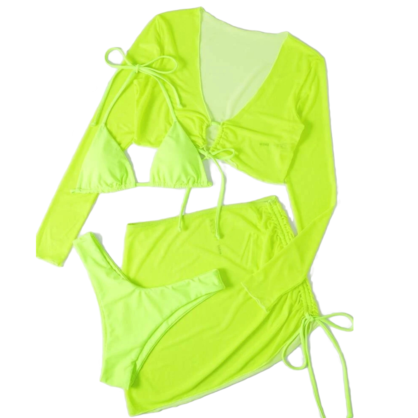 Женский Повседневный пляжный комплект бикини, однотонный бюстгальтер + укороченный топ с длинными рукавами + трусики в форме треугольника + юбка на завязках