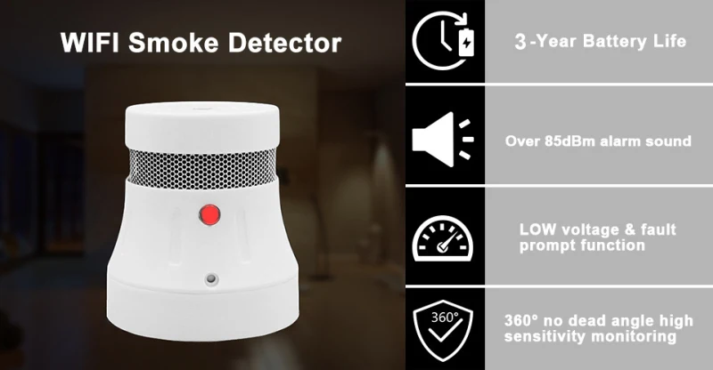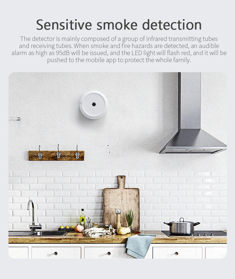 При обнаружении дыма и пожаров, звуковой сигнал до 85 дБ будет выдан с красным миганием светодиодный светильник и отправлен в мобильное приложение для защиты безопасности всей семьи.