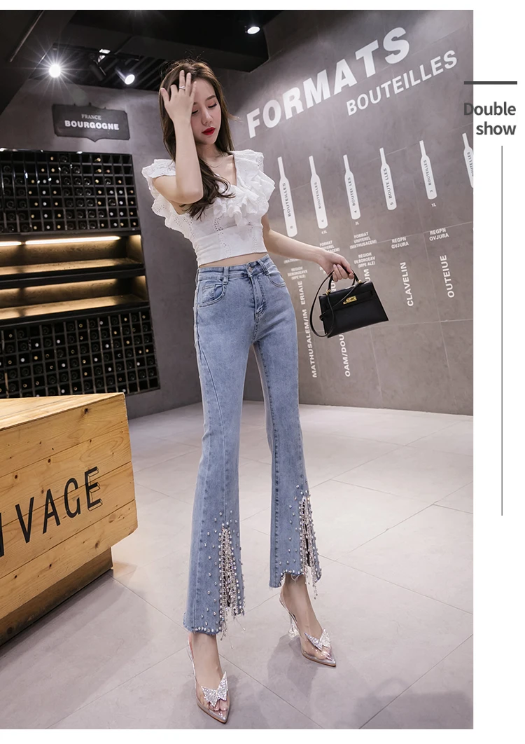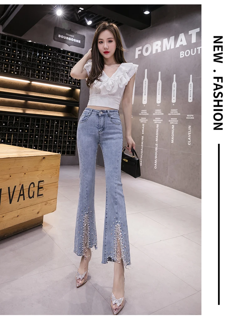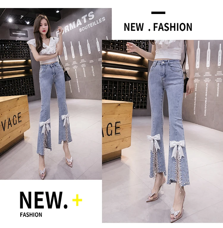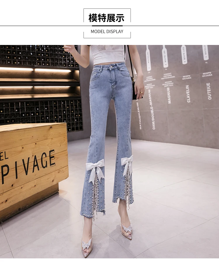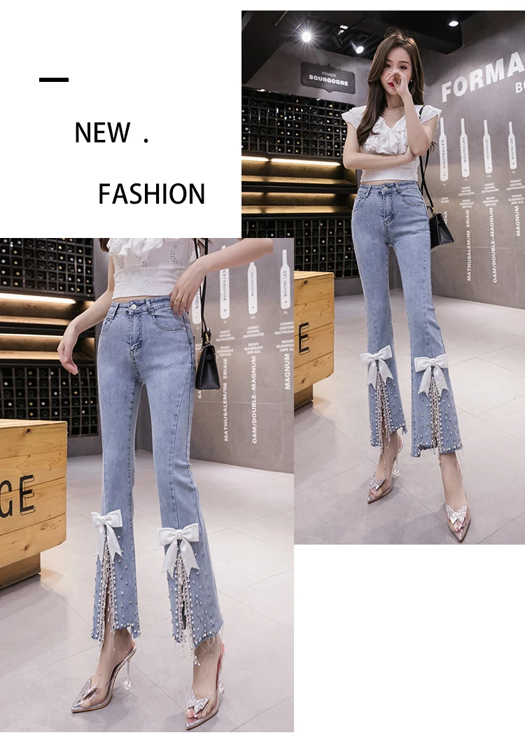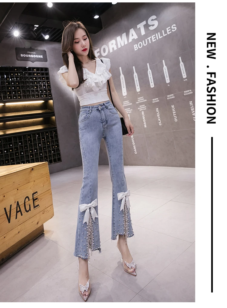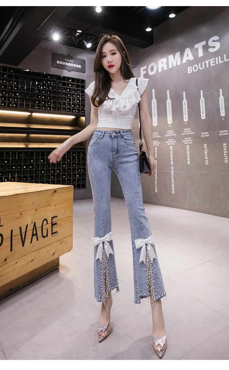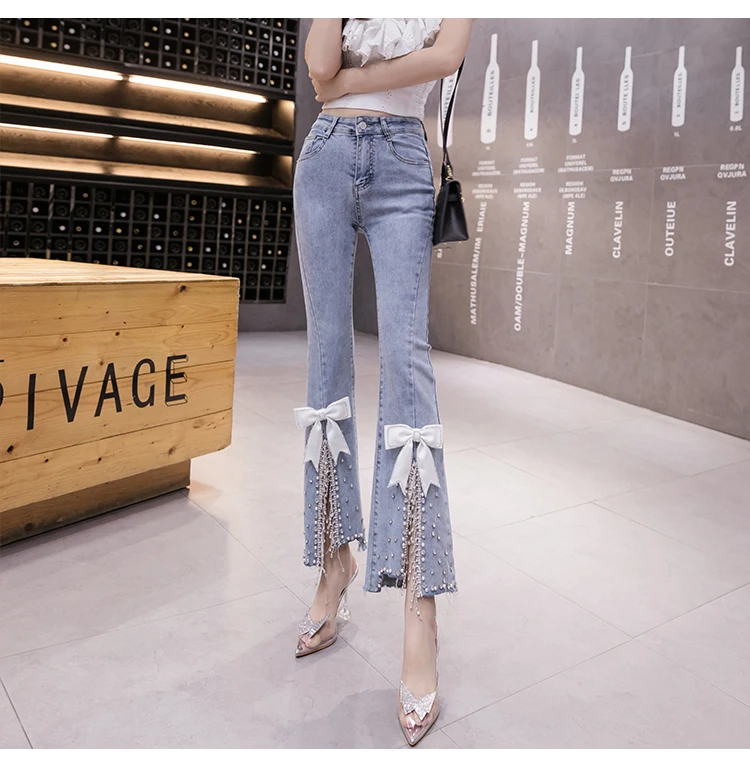 Женские джинсы с бусинами винтажные высокой талией и бантом расклешенные брюки