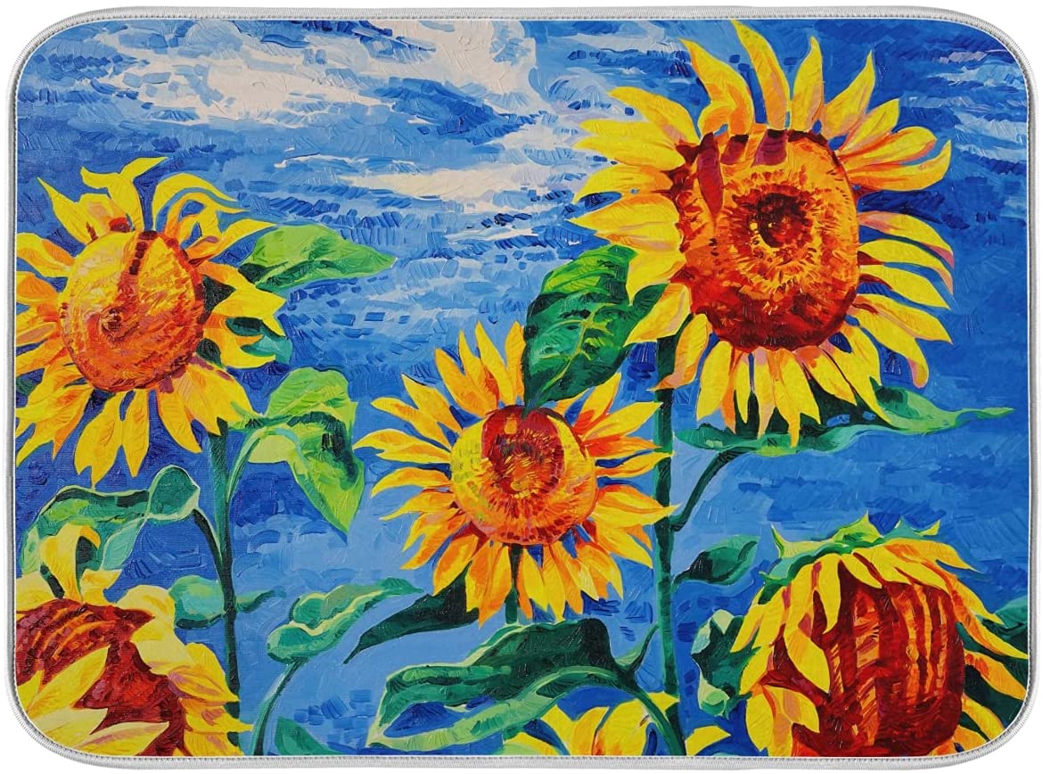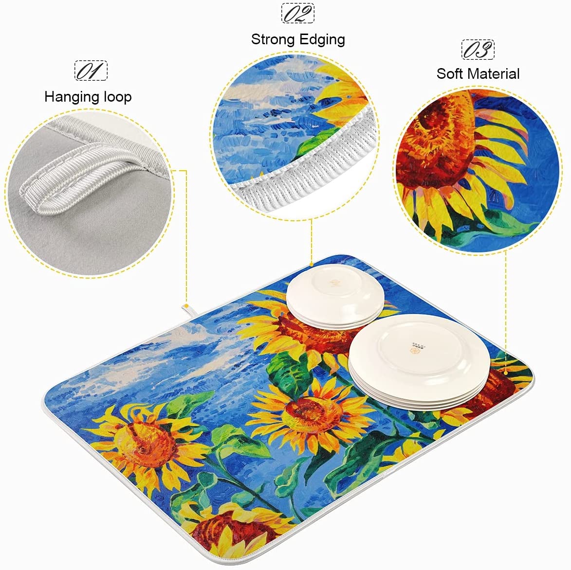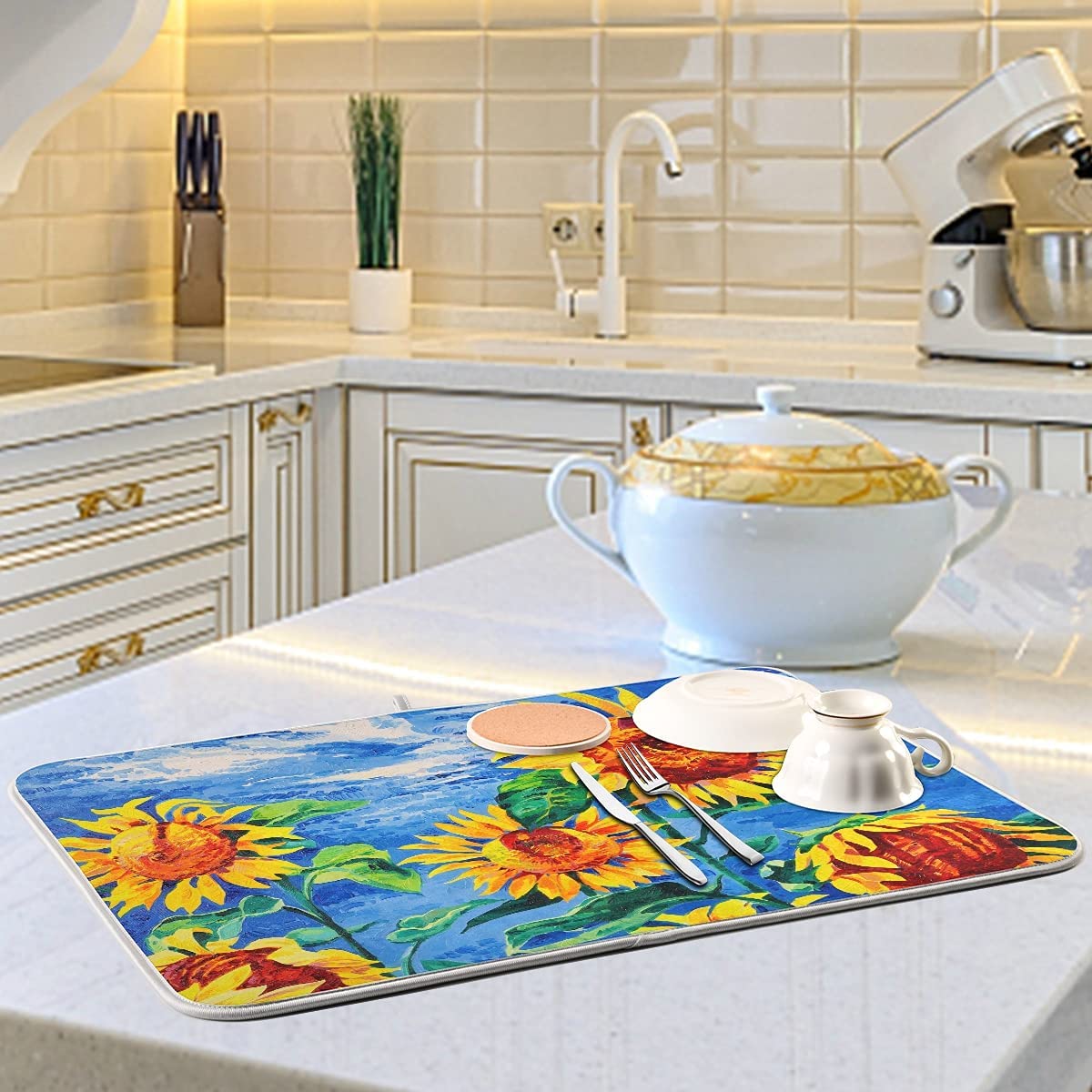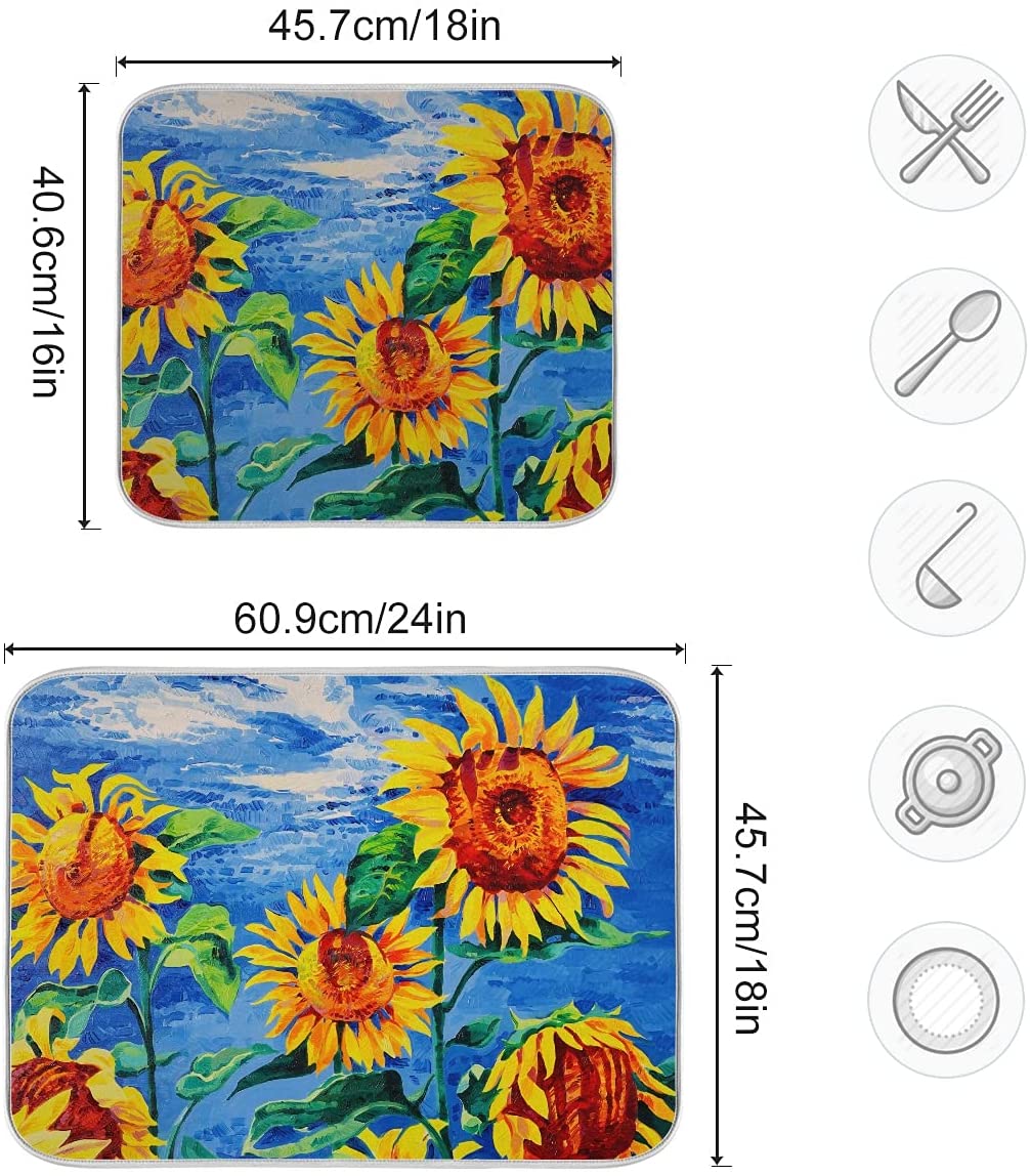 Поглощающий коврик для сушки посуды на кухонный стол с синим фоном и микрофиброй подсолнухом размером 18 x 24 дюйма.