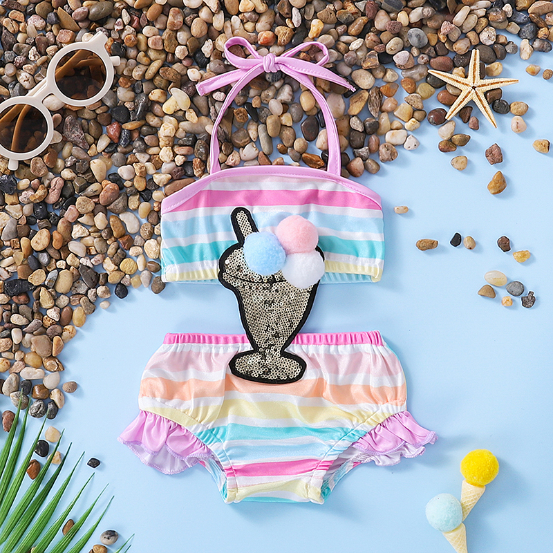 Одежда для купания в разноцветную полоску для маленьких девочек; Купальник с оборками и круглым вырезом; Купальник для пляжа, плавания, путешествий