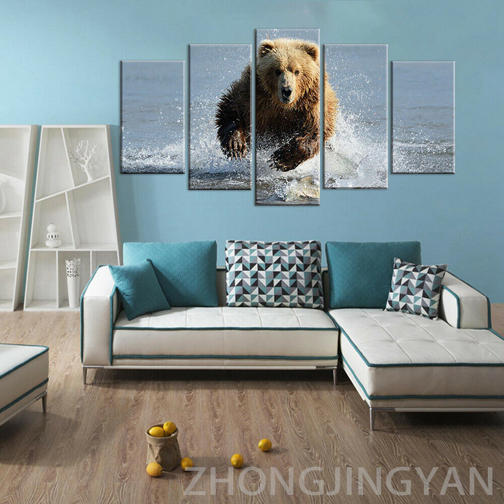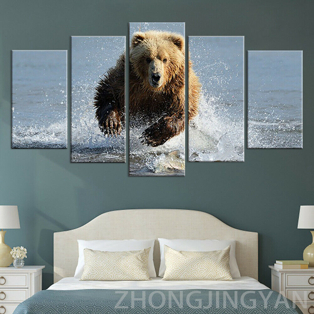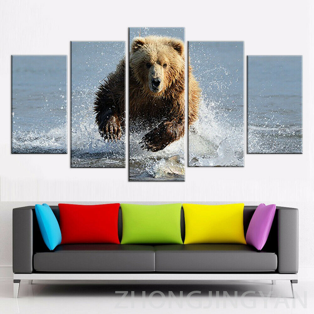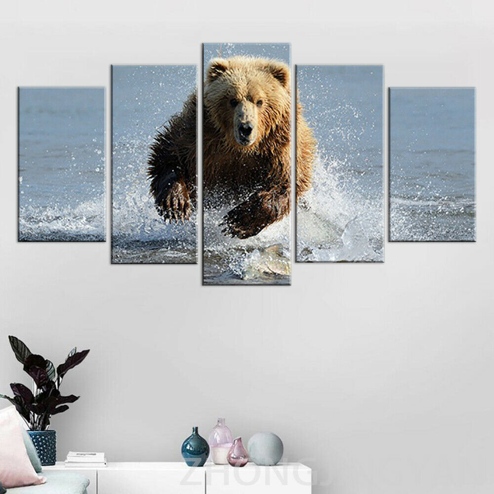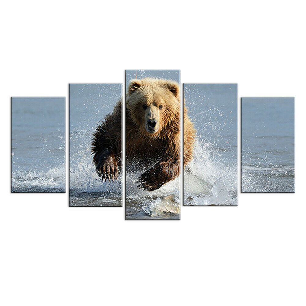 5 панельные животные гризли медведь бегущая река без рамки настенная живопись 5 шт. картины холст, рисунки, Постер Декор для комнаты