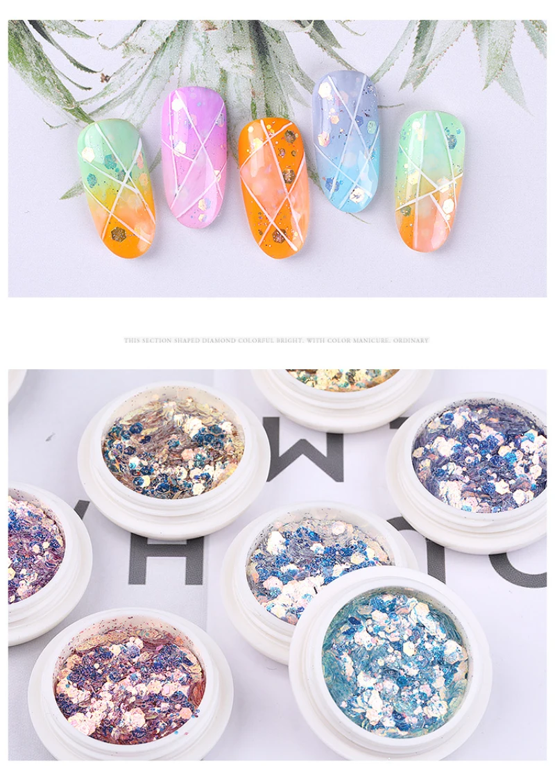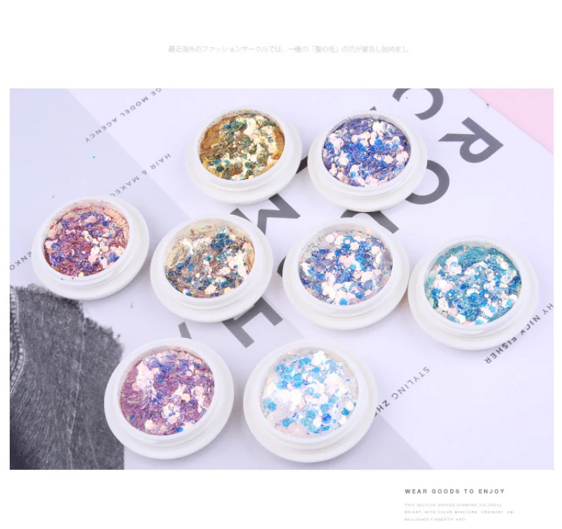 Название продукта: блестка для ногтей decorationGram Вес: 5gSize: 7,5*3,5*3,8 cmPackaging: oppSuitable для лак для ногтей, УФ, акриловые и Другое украшения ваших ноготков.