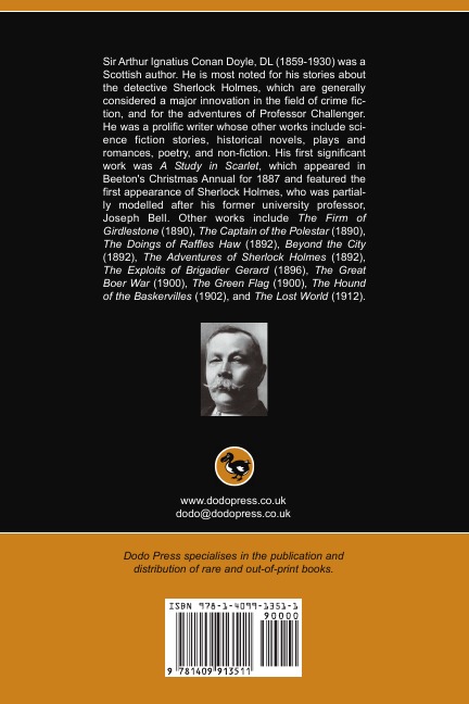 Sir Arthur Ignatius Conan Doyle, DL (1859-1930) was a Scottish author. He is most noted for his stories about the detective Sherlock Holmes, which are generally considered a major innovation in the field of crime fiction, and for the adventures of Professor Challenger. He was a prolific writer whose other works include science fiction stories, historical novels, plays and romances, poetry, and non-fiction. His first significant work was A Study in Scarlet, which appeared in Beeton's Christmas Annual for 1887 and featured the first appearance of Sherlock Holmes, who was partially modelled after his former university professor, Joseph Bell. Other works include The Firm of Girdlestone (1890), The Captain of the Polestar (1890), The Doings of Raffles Haw (1892), Beyond the City (1892), The Adventures of Sherlock Holmes (1892), The Exploits of Brigadier Gerard (1896), The Great Boer War (1900), The Green Flag (1900), The Hound of the Baskervilles (1902), and The Lost World (1912).