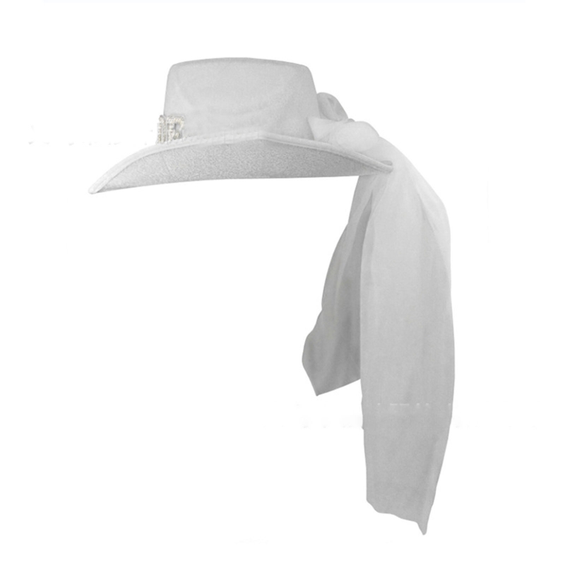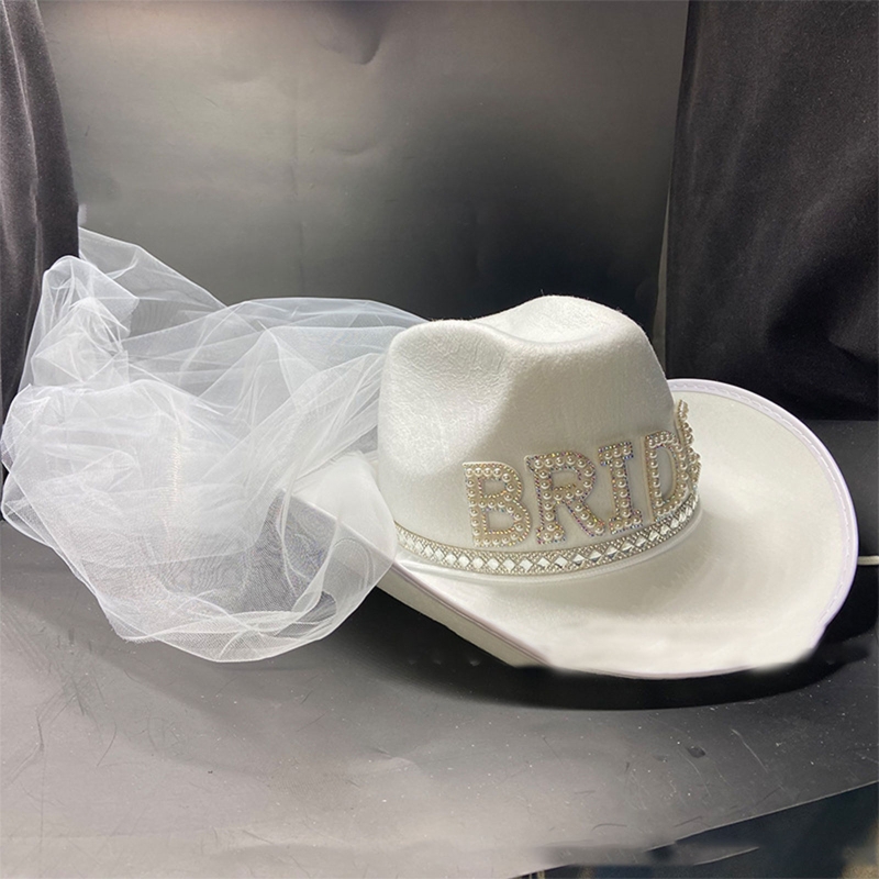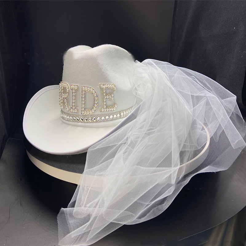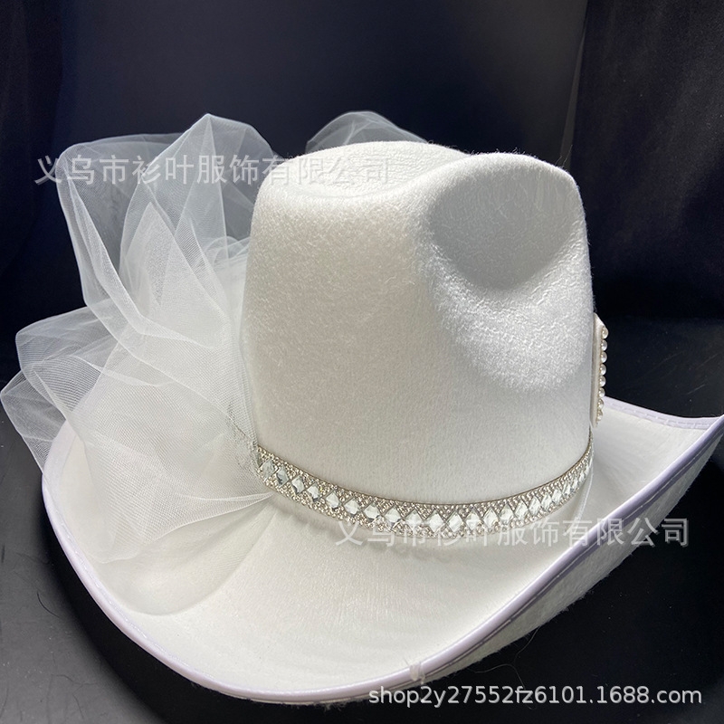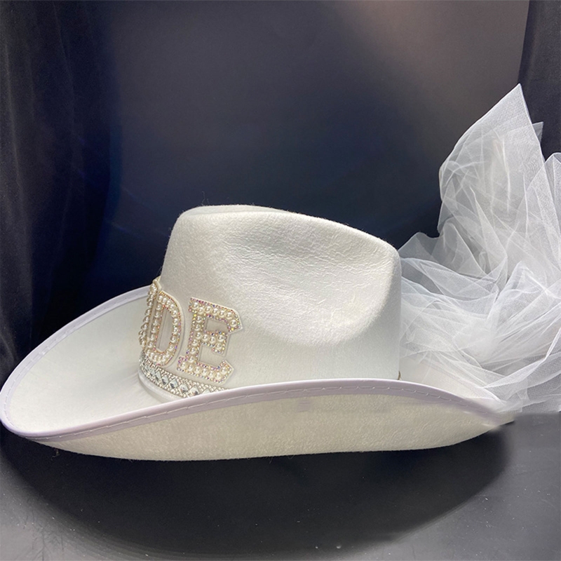 Особенности: Western в ковбойском стиле шляпа и обеспечивающим надежное крепление к вуалью с изображением невеста в искусственный жемчуг и сверкающие стразы.