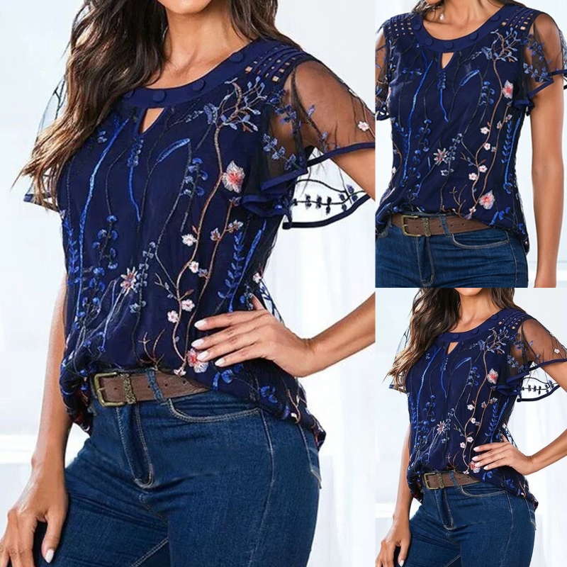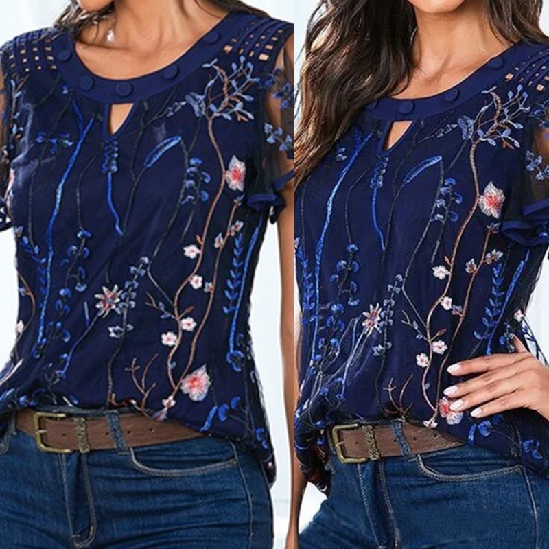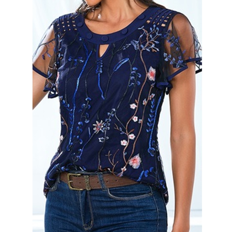 Прозрачные сетчатые оборки, короткие рукава, круглый вырез, пуговицы, украшенные вырезом, Повседневная застежка-молния.