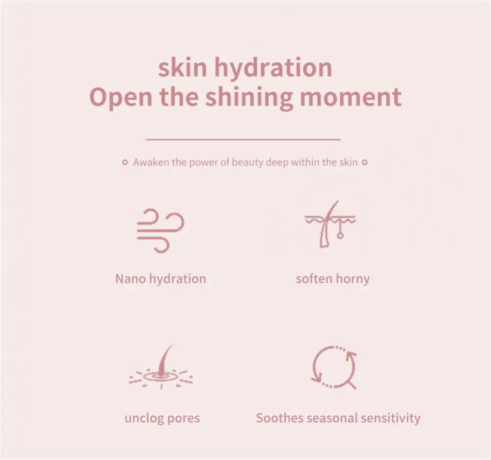 3. 【Увлажнение и увлажнение 】тонкий туман нежный и деликатный, может проникать в базальный слой, способствует поглощению питательных веществ, эффективно увлажняет кожу, питает кожу, снимает сухость кожи, сбалансирует воду для лица и масло, осветляет тон кожи, подходит для всех типов кожи.