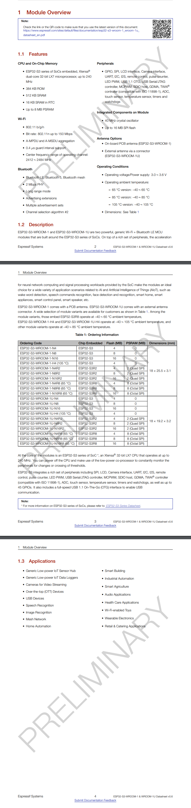 ESP32-S3 Двухъядерный XTensa LX7 MCU, способный работать на 240 МГц. Помимо 512 Кб встроенной SRAM, он также поставляется со встроенным 2,4 ГГц, 802,11 b/g/n Wi-Fi и Bluetooth 5 (LE) подключение, что обеспечивает большой дальности поддержку. Он имеет 45 программируемых GPIOs и поддерживает богатый набор периферийных устройств. ESP32-S3 поддерживает более крупные, высокоскоростные octal SPI flash и PSRAM с настраиваемым кэшем данных и инструкций.