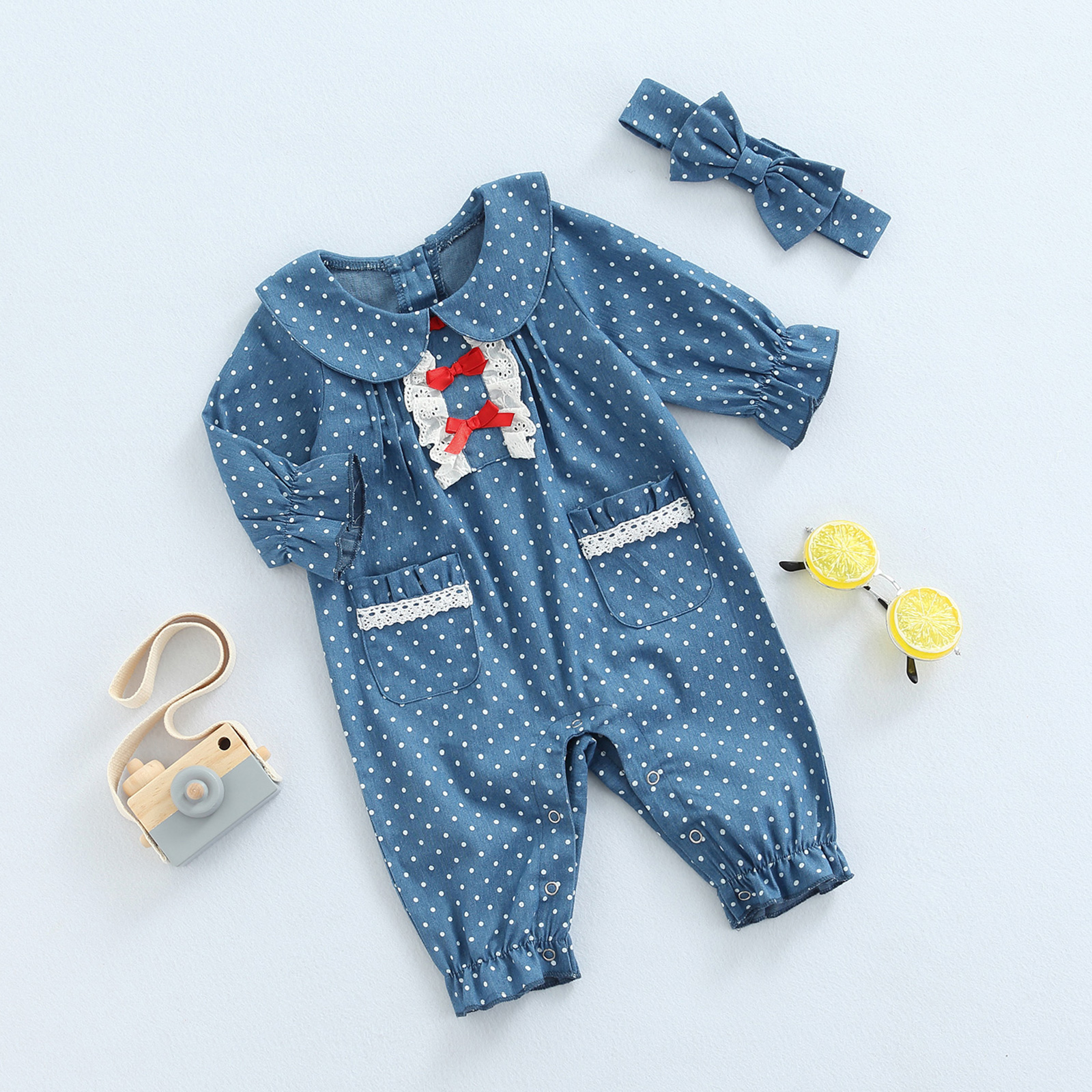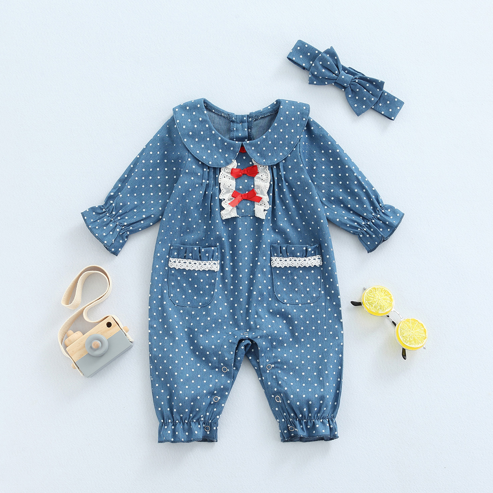 Комбинезон с длинными рукавами для маленьких девочек + повязка на голову с бантом; Кружевная одежда в горошек