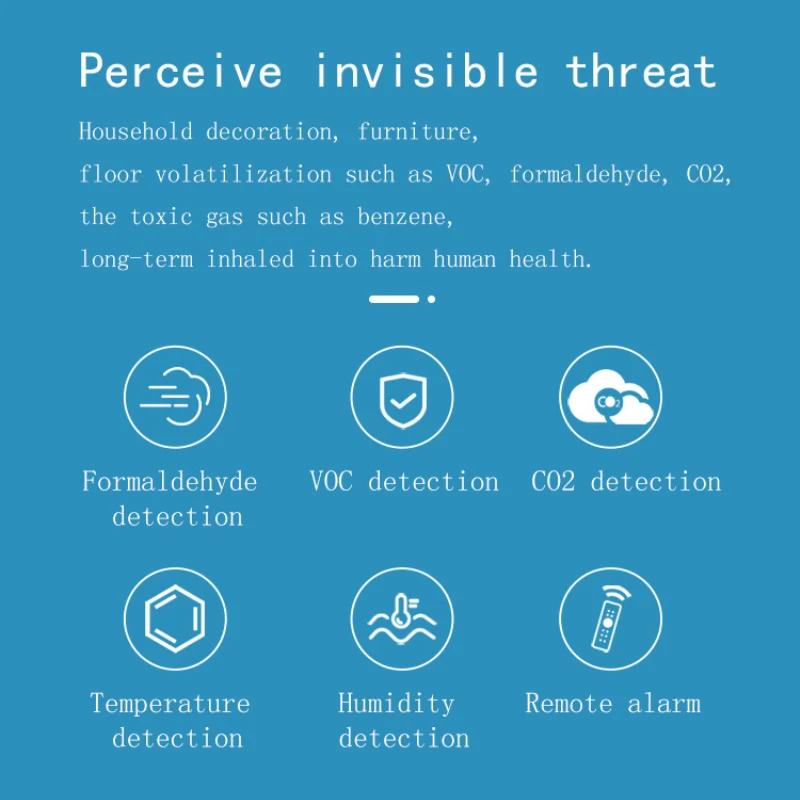 После подключения к приложению, он может быть связан с различными продуктами smart home. Например, при обнаружении чрезмерного формальдегида/Лос умный очиститель воздуха автоматически включается; Когда превышен углекислый газ, Умный вентилятор свежего воздуха автоматически включается; Когда температура ненормальная, температура кондиционера автоматически регулируется; Когда влажность слишком низкая или слишком высокая, Смарт-увлажнитель будет включаться/выключаться автоматически; Когда определённый параметр будет обнаружен, чтобы превысить стандарт, на будильник будет отправлено сообщение (вышеуказанная функция умной связи должна быть совместима с продуктом smart home)