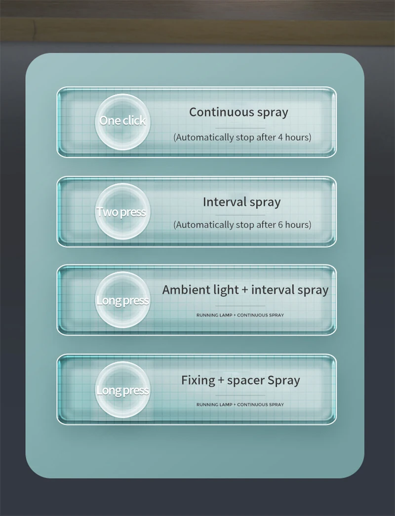 [Режим распыления] Один пресс: непрерывный спрей (остановка автоматически через 4 часа), второй пресс: интервальный спрей (автоматическая остановка через 6 часов), длительное нажатие: интервальный светильник окружающего воздуха, длительное нажатие: интервальный спрей для фиксации цвета.