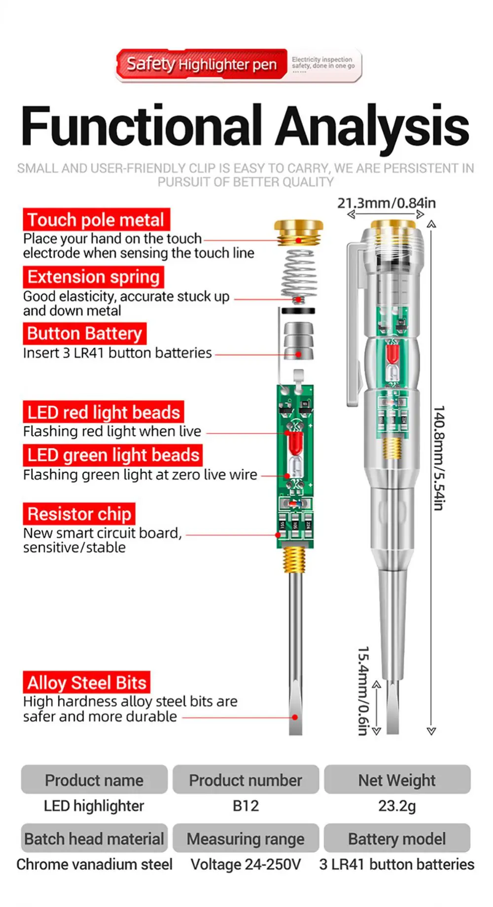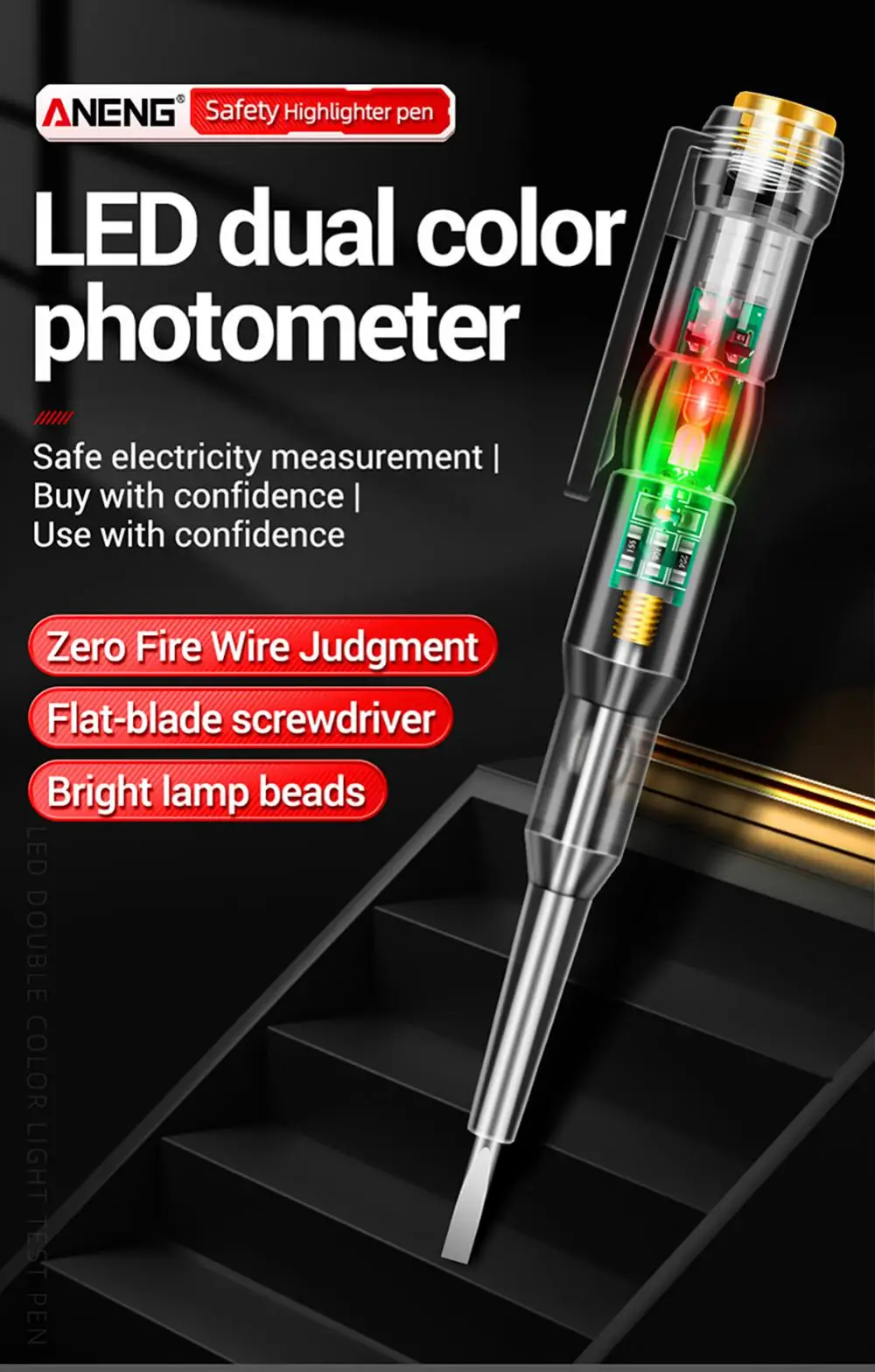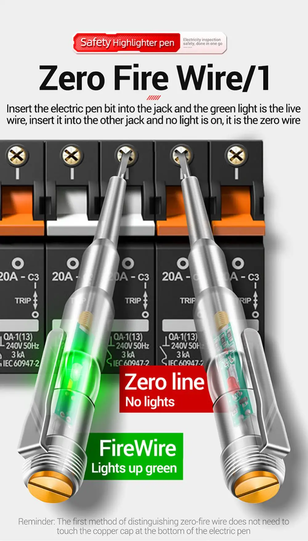 1. Обнаружение нейтральной линии/живой линии: светодиодный красный светильник и зеленый светильник показывают живую линию, зеленый светильник-нейтральную линию