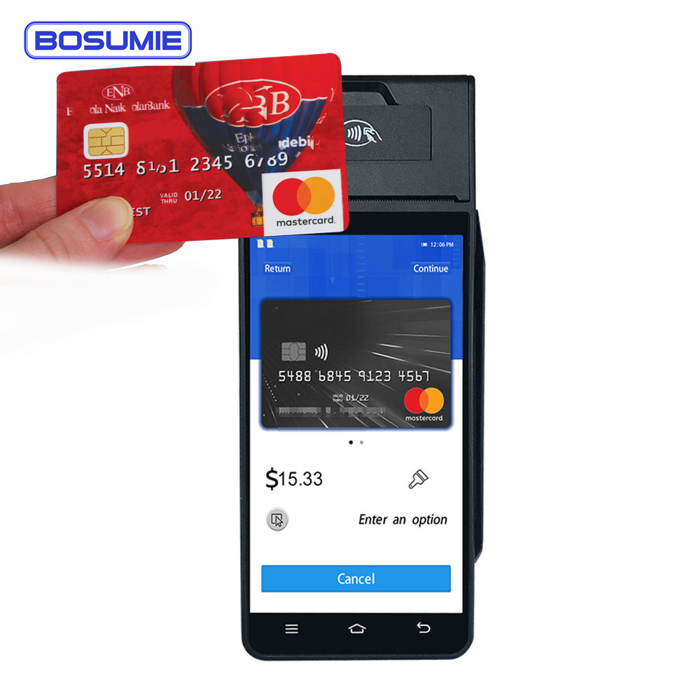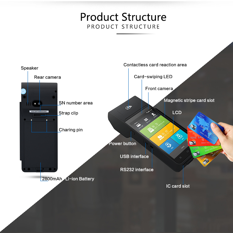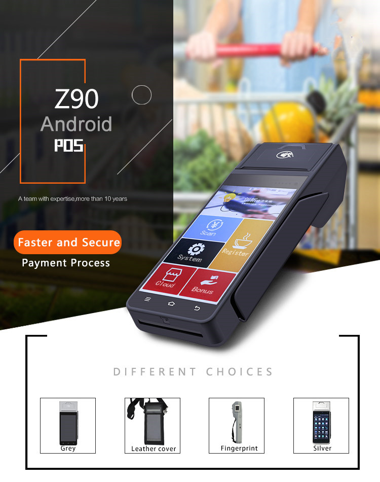 Z90 4G Smart POS machine, android 7.1 operating system,5.0 inch screen touch, long standby battery capacity is 2800 mAh/7.4V, fast thermal printer,fingerprint collection module(optional),5 MP camera, 2G/3G/4G/wifi/GPS/bluetooth communication, magneticstripe, induction IC card, contact IC card.