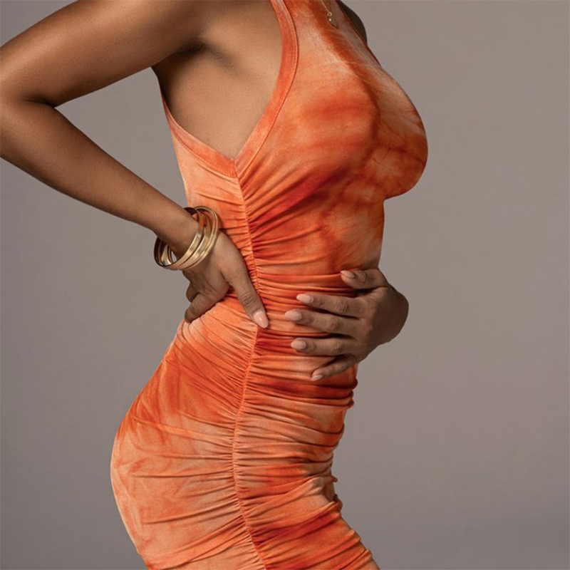 Градиентная цветная печать, плиссированные с рюшами дизайн, сексуальный pacakge бедра, длина до колена, эластичная высокая талия.