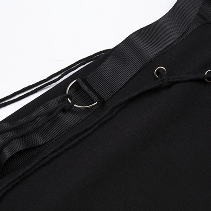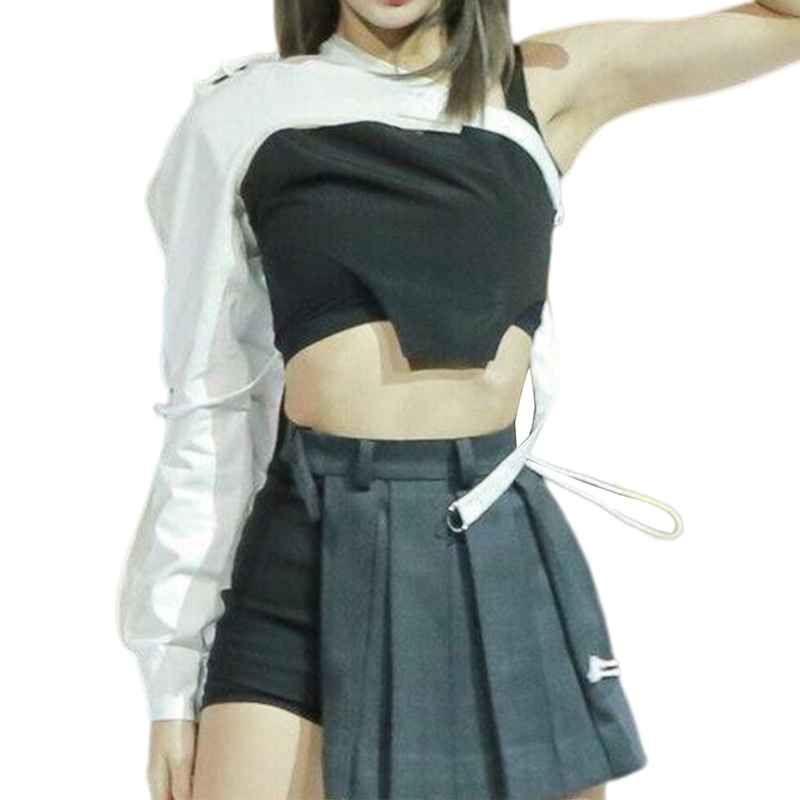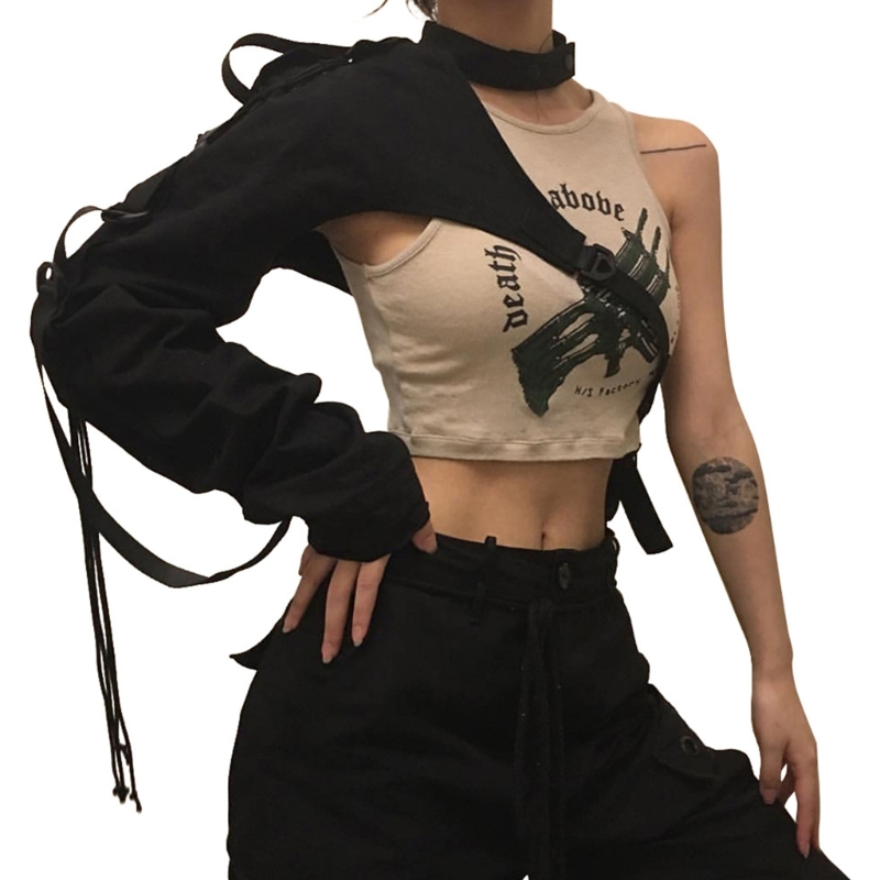 Регулируемая пряжка, воротник-чокер с лямкой на шее, длинный рукав на одно плечо, ультра-короткая укороченная длина, ассиметричный.