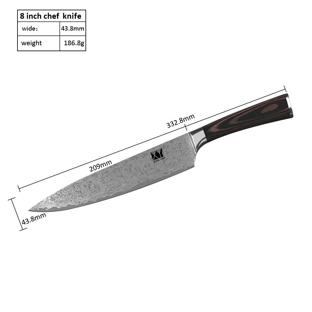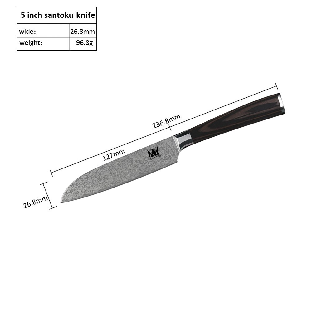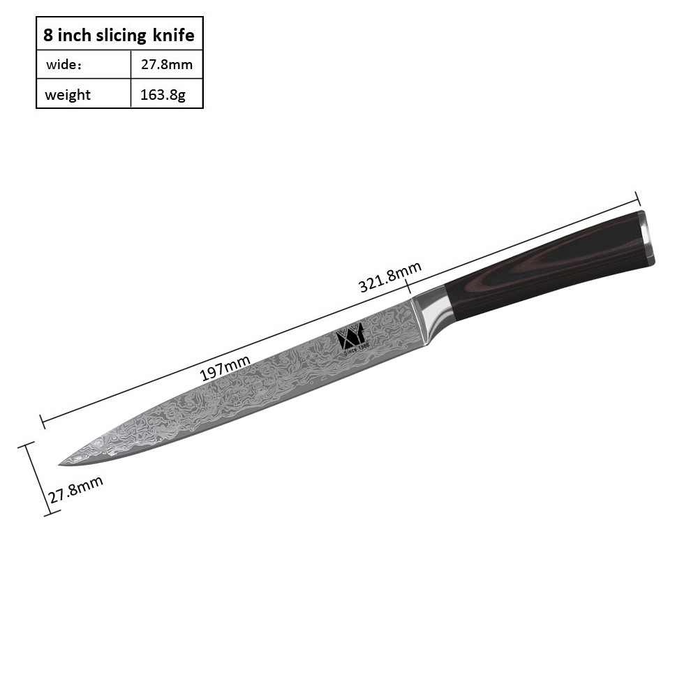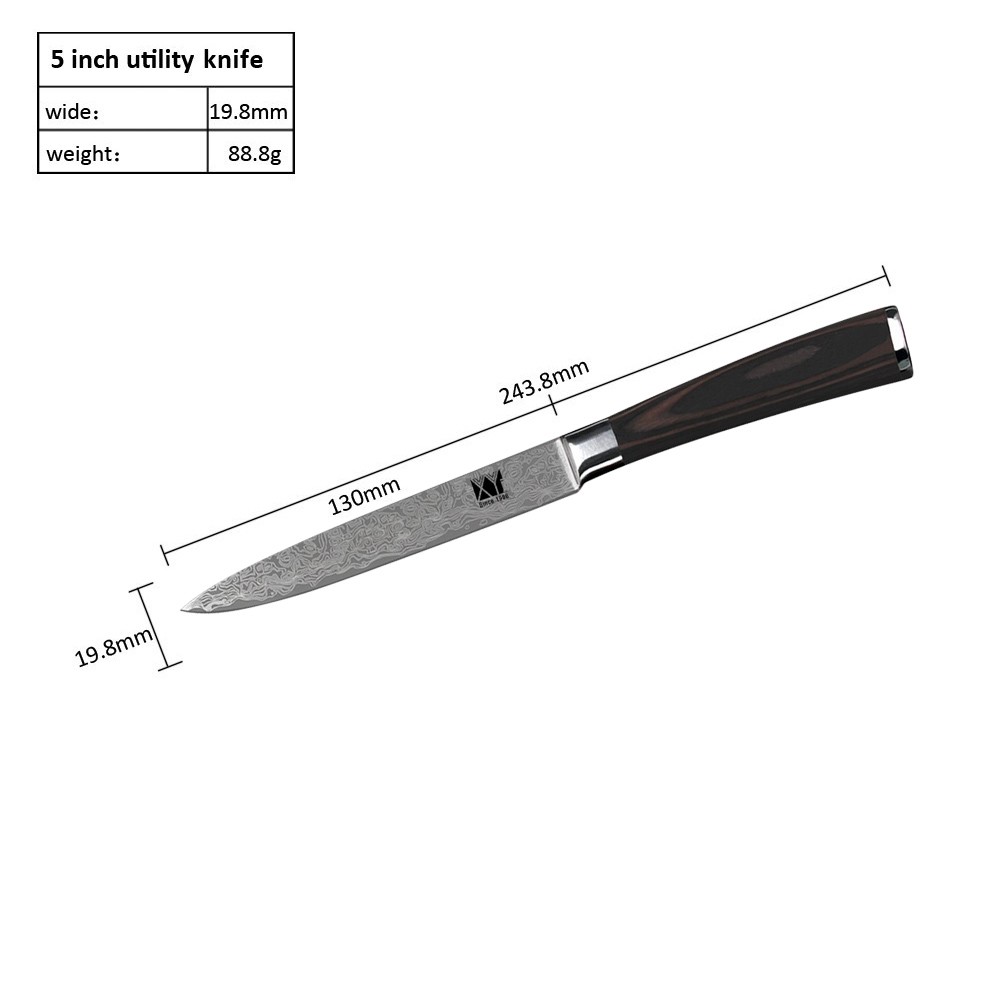 Вышивка Крестом Пакет включает 1 * 8-дюймовый нож шеф-повара Общая длина: 332.8 мм Длина лезвия: 209 мм (8 ") Ширина лезвия: 43.8 мм Вес: 186.8 г 1 * 8-дюймовый Нож для нарезки Общая длина: 321.8 мм Длина лезвия: 197 мм (8 ") Ширина лезвия: 27.8 мм Вес: 163.8 г 1*5 дюймов нож santoku Общая длина: 236.8 мм Длина лезвия: 127 мм (5 ") Ширина лезвия: 26.8 мм Вес: 96.8 г 1*5 дюймов инструментальный нож Общая длина: 243.8 мм Длина лезвия: 130 мм (5 ") Ширина лезвия: 19.8 мм Вес: 88.8 г