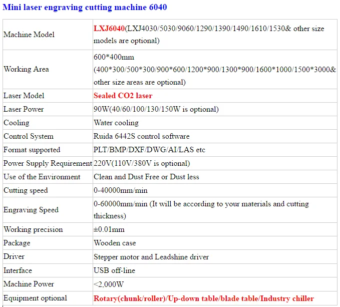 Углекислый лазер как источник энергии, в сочетании с электронным, механическим, Компьютерными технологиями разработаны. Лазерная головка и заготовка не контактируют, не царапают поверхность, Kerf, высокая точность, является идеальным выбором для различных обрабатывающих отраслей. 1>RECI CO2 лазерная трубкаИмеет хороший луч и прочную стабильность, срок службы более 8000-10000 часов 2>Панель управления DSP на английском языке, USB интерфейс, Автономная или онлайн-работа, чтение U flash 3> принимает импортированныйHIWIN Линейная рельсовая направляющая, С высокой точностью. 4> принимает Leadshine трехфазныйШаговый двигатель привода, Он стабильный и надежный, и С высокой точностью. 5>Указатель точки люминофора Красного свечения, Система определения местоположения, показывающая точный контур. 6> медовый гребень и лезвия стола для крепления заготовок являются дополнительными 8> циркуляция водяного охлаждения, гарантирует постоянную температуру воды, Увеличьте время работы лазера 9> Изоляция пыли и дыма 10> Защита huff, воздушный инжектор защищает объектив от тепла и выхлопных газов 11> фирменное программное обеспечение поддерживает различные форматы файлов: PLT,BMP,DXF,DST, T100 и т. д. 12> поставляем различные варианты • Рабочий стол вверх и вниз подходит для резки и гравировки на разной высоте Материалы. • Роторные системы, подходят для гравировки материалов цилиндра. |