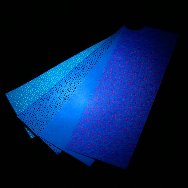 (Прозрачный УФ Флуо, УФ Флуо плюс черное пятно, УФ Флуо плюс оранжевое пятно, УФ Флуо плюс зеленое пятно)
