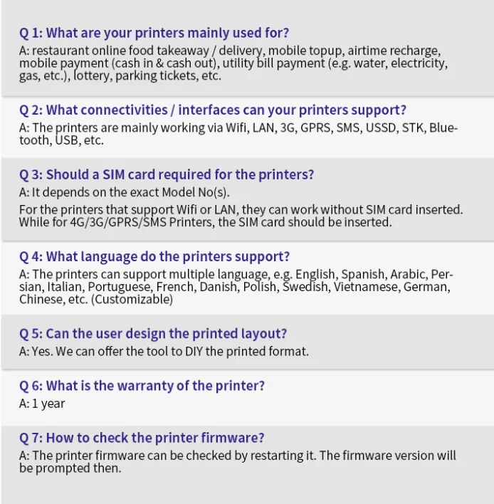 В течение 15 лет, Мы получили отличный опыт в производстве различных продуктов, таких как GSM SMS принтер, LAN WIFI принтер, 3G принтер, 3G и Wifi принтер, Bluetooth принтер и кардридер принтер.