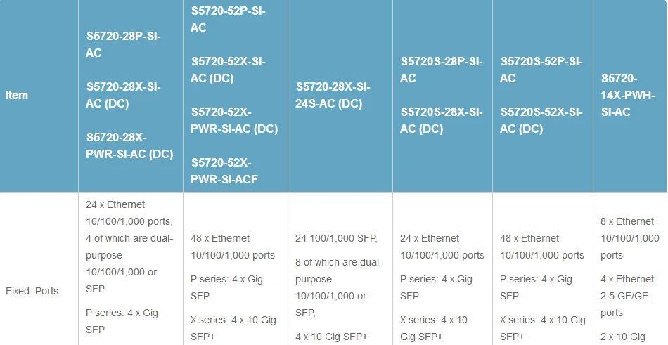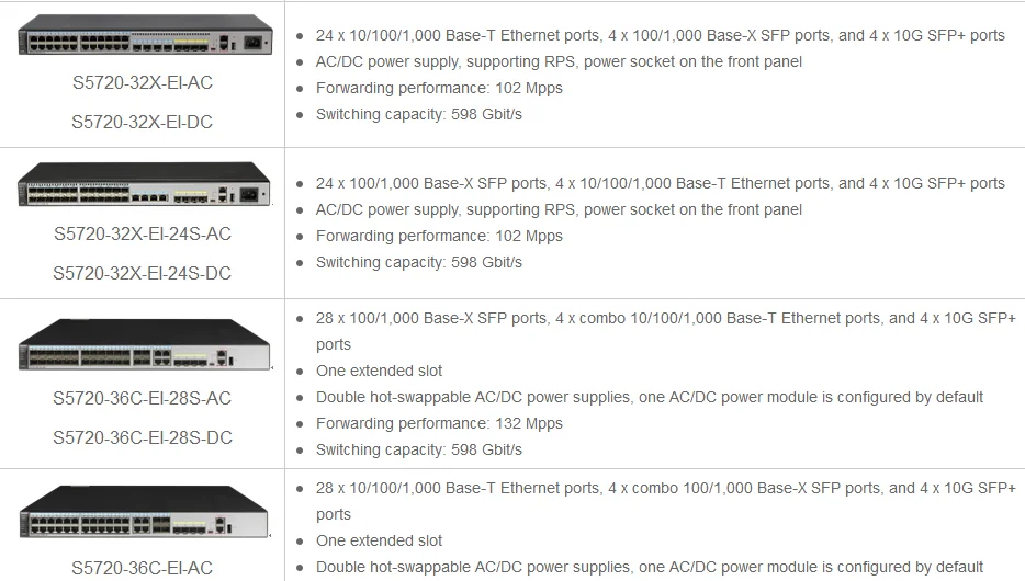 S5720-36C-EI-AC/S5720-36C-PWR-EI-AC: 28 × 10/100/1000Base-T (4GE Combo SFP), 4 × 10 GE SFP + | |