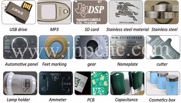 Электронные и коммуникационные инструменты, микросхемы IC, компьютерные аксессуары и электроприборы. Все виды точных компонентов, аппаратных инструментов, инструментов и счетчиков. Аэрокосмические устройства, ювелирные изделия, часы, подарки, офисные принадлежности, знаки торговой марки, сантехника, столовые приборы, еда, напитки, табак и алкоголь и многие другие отрасли промышленности для маркировки логотипов, символов, слов, А также может быть использован в производственной линии для массового количества работы.