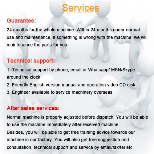 Обычно мы заботимся о ваших машинных упаковках Во-первых, наш работник позаботится о том, чтобы ваша машина была чистой, прежде чем посылка, а затем добавьте эластичную пленку для всей машины и запасные части для сладкой защиты, наконец, мы сделаем экспортный Стандартный прочный фанерный чехол посылка в соответствии с вашими потребностями. | ||||||||||||||||||||||||