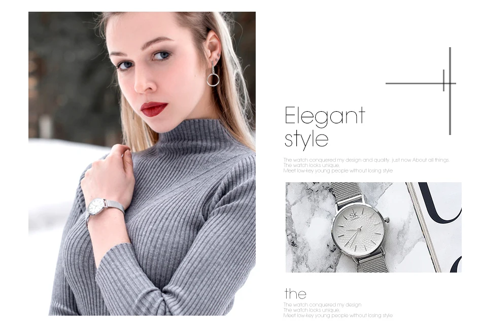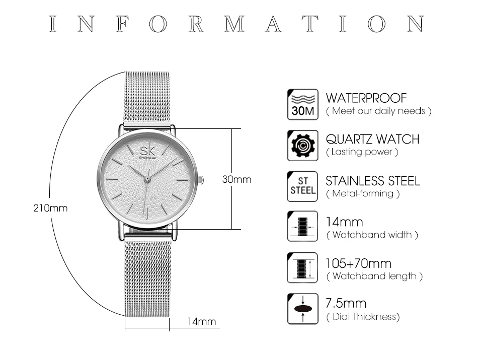 Фирменное наименование: shengkeПол: Для женщинТип: кварцевые наручные часыСтиль:ПлатьеТип застежки:Скрытая застежкаДлина ремешка: 24 смШирина ремешка: 14 ммДиаметр циферблата: 30 ммТолщина корпуса: 9 ммЦвет: черный, серебристый, золотистый,