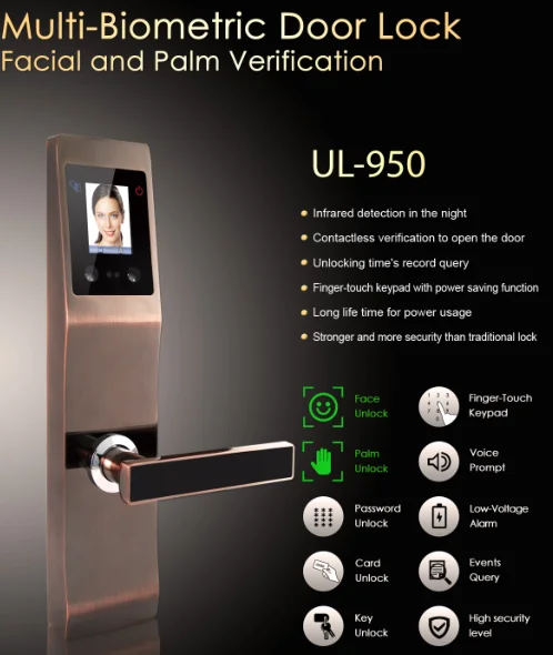 UL-950 прочнее и безопаснее, чем традиционный замок, и он приносит новый безопасный замок.С классическим и элегантным дизайном, гальваническим и полировочным покрытием, одним пальцем, чтобы разблокировать и несколько болтов, UL-950 привносит в новый безопасный замок. Мы используем новейший алгоритм отпечатков пальцев, с высокоскоростным ЦП, идентификация для разблокировки достаточно быстрая. Скрытая сенсорная клавиатура является водонепроницаемой, когда работа завершена, блокировка автоматически выключит светильник датчика отпечатков пальцев, клавиатуры и ЖК-дисплея, это помогает нам экономить энергию в большинстве случаев. Мероприятия всех партнеров также могут быть заданы вовремя!