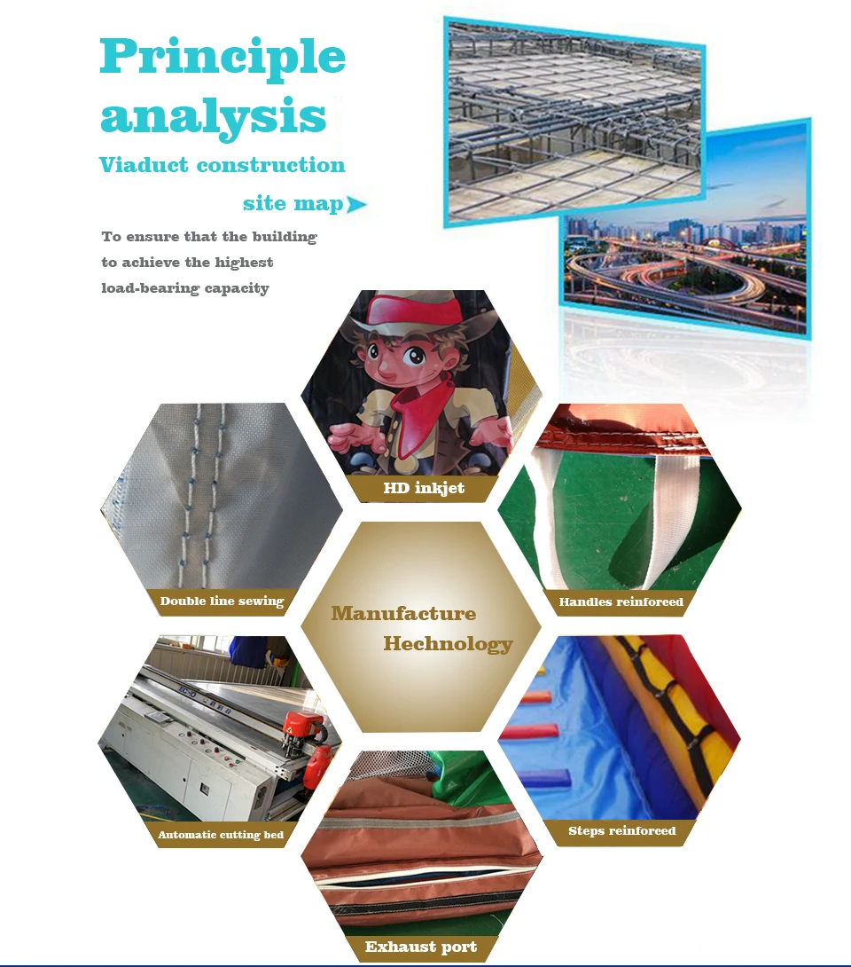 С высоким качеством и сетчатым ПВХ-материалом. Этот материал является своего рода профессиональной надувной тканью, хорошей устойчивостью к холоду, может достигать 40 градусов ниже нуля низкой температуры; Огнестойкая производительность хорошая, 5 секунд вдали от огня.