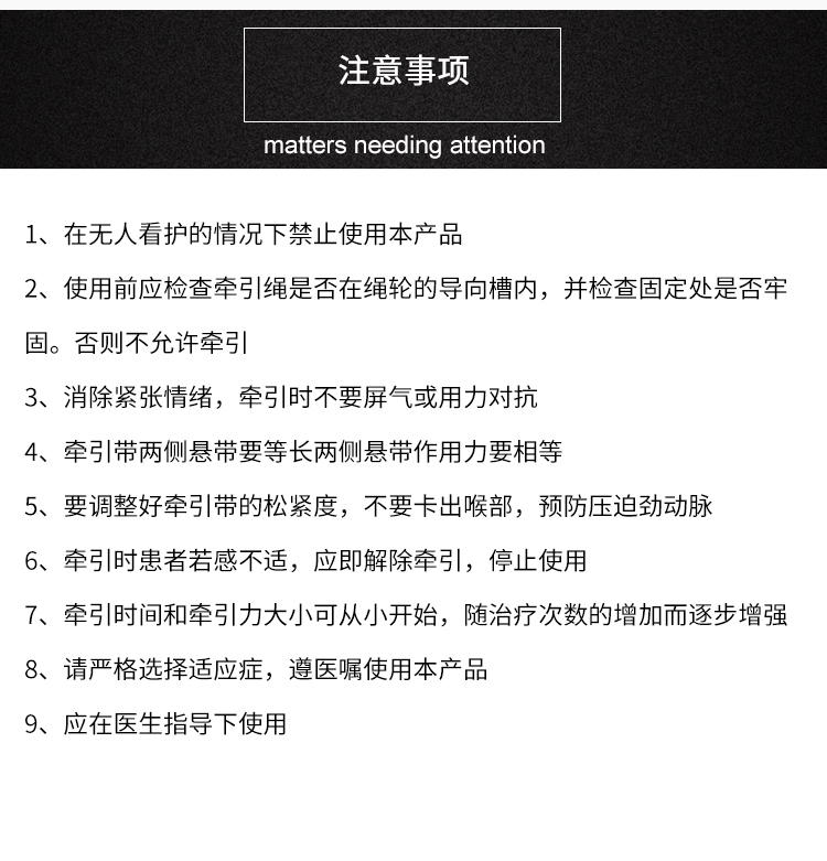 Тяговый вес от 3 до 4 кг, возраст, физическая сила, развитие жира на шее и ответ пациента на лечение тяги, соответствующее увеличение тягового веса и увеличение времени тяги, шейное тяговое устройство может регулировать вес в соответствии с фактическими потребностями. Лечение: небольшой вес тяги 7 дней для курса лечения. Два курса отдыха в течение 1-2 дней. В Тракционной обработке в то же время, также может быть использован с другим лечением, чтобы нанести вред телу превалирует.