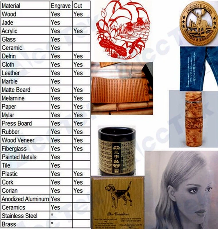 Акрил, дерево, ткань, кожа, МДФ, фанера, бамбук, резина, асбестовая резина, бумага, ПВХ, пена, Эва, пластик, большинство неметаллических и т. Д.