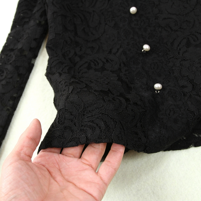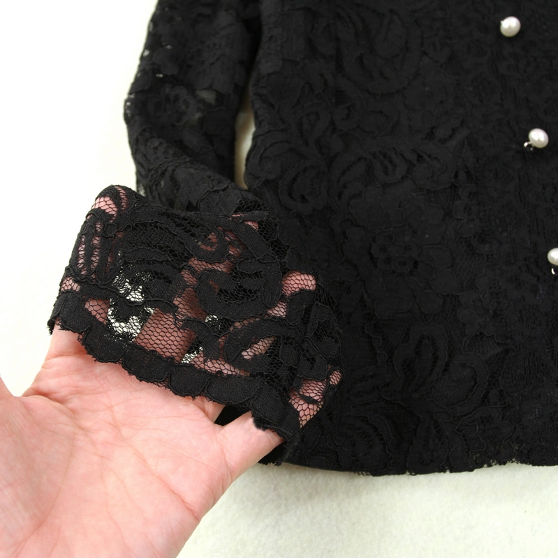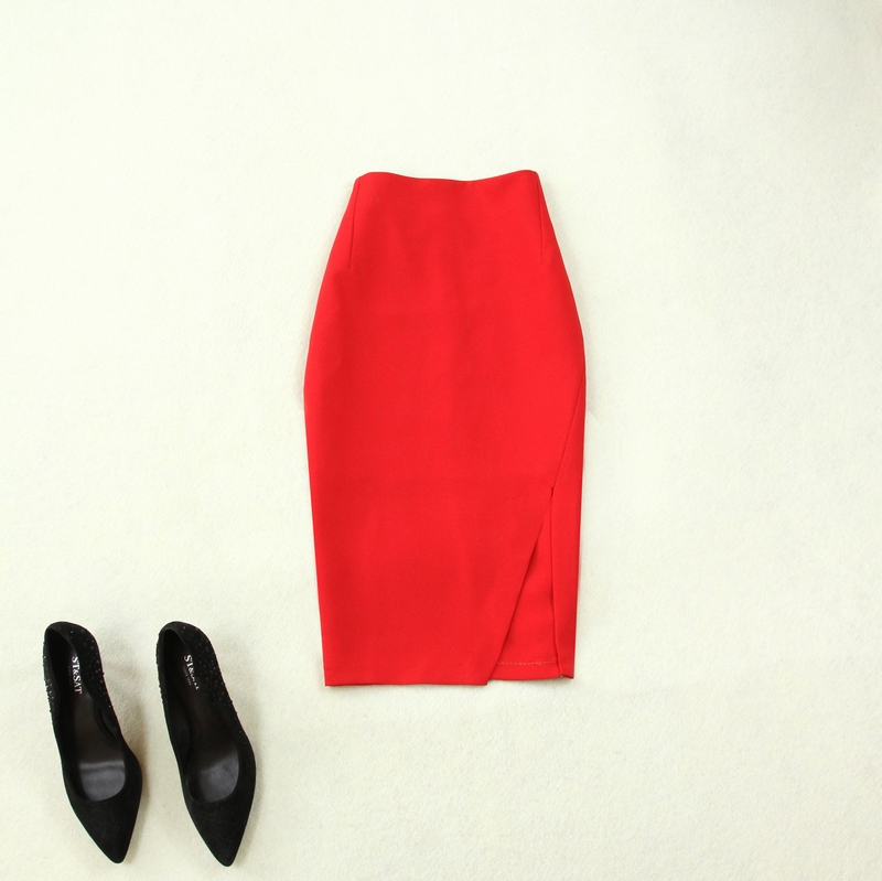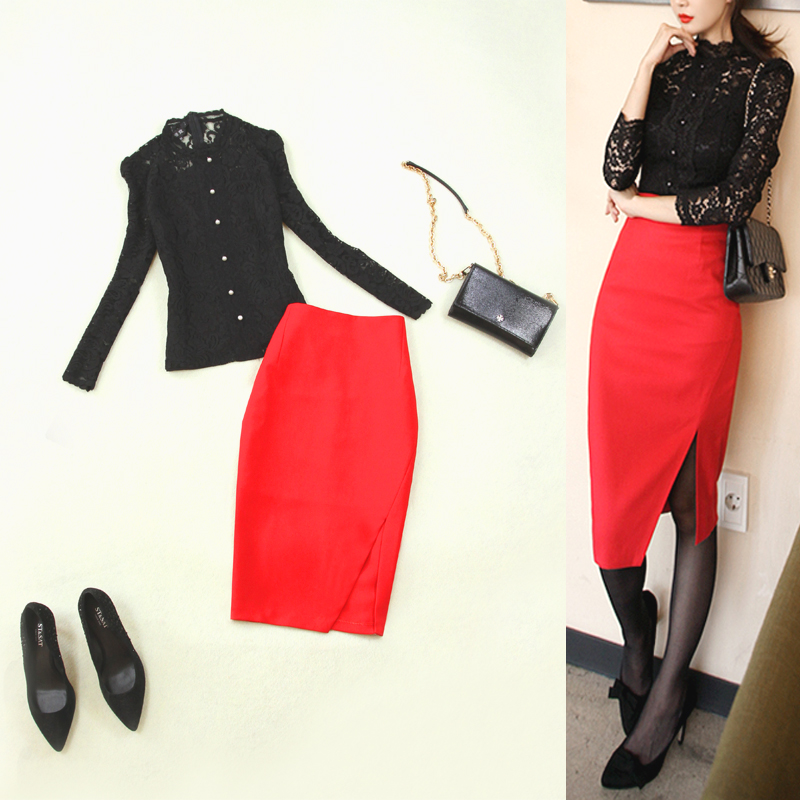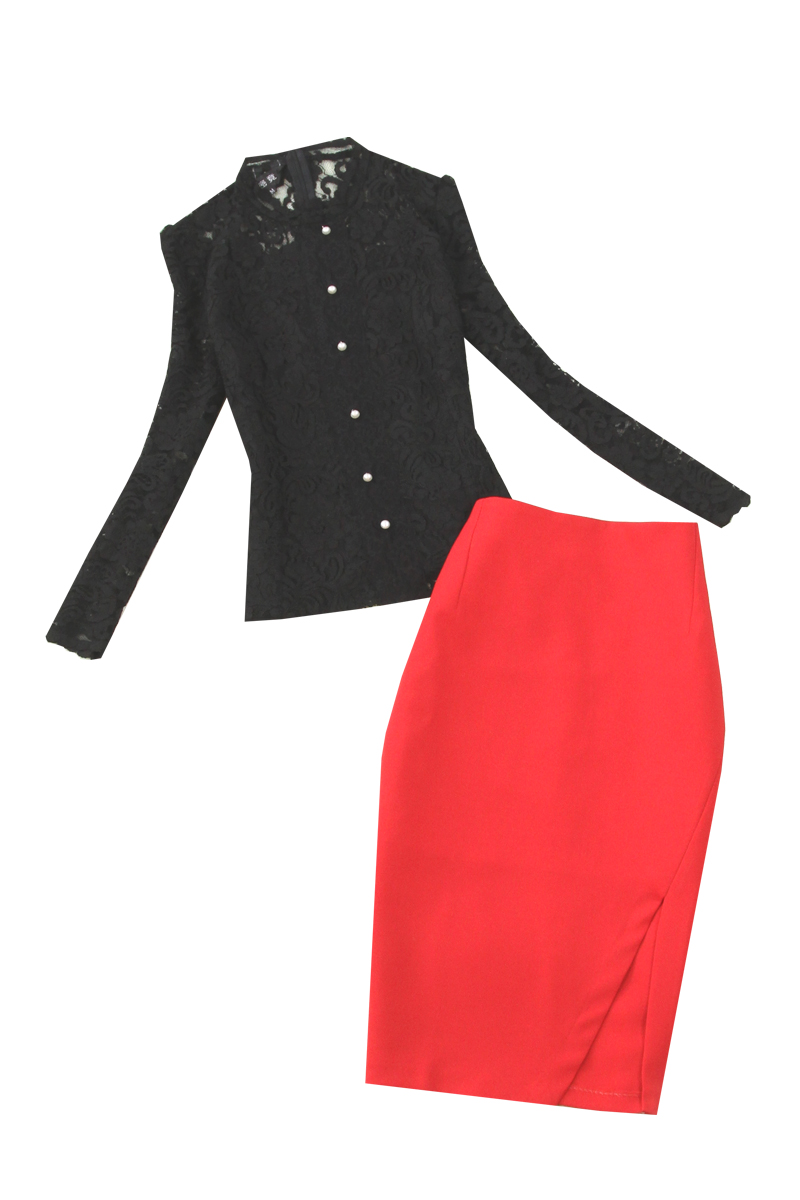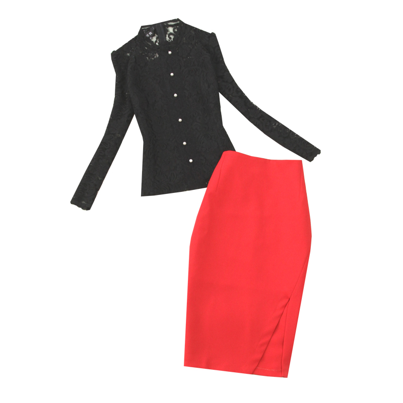 Комплект женский, черный, кружевной воротник-стойка, элегантный темперамент, тонкая рубашка, подкладка + красная высокая талия, сумка, бедра, юбка, элегантный комплект из двух предметов