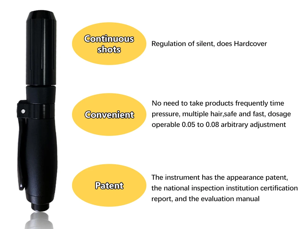 Быстрая инъекция менее чем за 1/3 секунды, микро-отверстие и автоматизированное давление пружины делают инъекции с 'серой' практически безболезненно