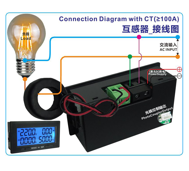 2. ≥AC100A -- красные и черные провода подключены к источнику питания DC8-18V.Two видов теминалов: черные теминалы являются входными теминалами переменного напряжения, зеленые теминалы для трансформатора тока.Не связывайтесь неправильно. Или он будет сожжен.